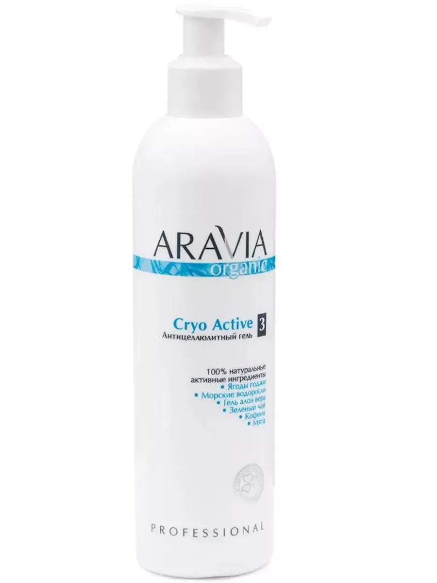 Aravia Cryo Active Anti-Cellulite Gel 300 ml. This anti-cellulite gel with a comfortable cooling effect activates microcirculation and oxygenation processes, providing an antioxidant effect. Caffeine enhances lymphatic drainage, optimizes metabolism, and tones the skin. Green tea helps prevent capillary pathologies and normalizes tissue respiration. Seaweed saturates the skin with vitamins and minerals, moisturizes, and smoothes the microrelief, making the appearance of cellulite less noticeable. With regular use, it effectively breaks down fat deposits and improves skin firmness and elasticity. Recommended use: Cellulite stages 1-4, localized fat deposits, vascular network, atonic skin, puffiness. Use alone and as an activator under neutral wraps and hardware procedures. Ingredients:Aqua, Glycerin, Urea, Propylene Glycol, Organic Camelia Sinensis Leaf Extract, Organic Lycium Barbarum Fruit Extract, Organic Aloe Barbadensis Gel, Organic Peppermint Leaf Extract, Acrylates/C10-30 Alkyl Acrylate Crosspolymer, Triethanolamine, Caffeine, Menthol, Benzyl alcohol (and) Ethylhexylglycerin, Iodopropynyl Butylcarbamate, Fucus Vesiculosus Extract, Laminaria Saccharina Extract.