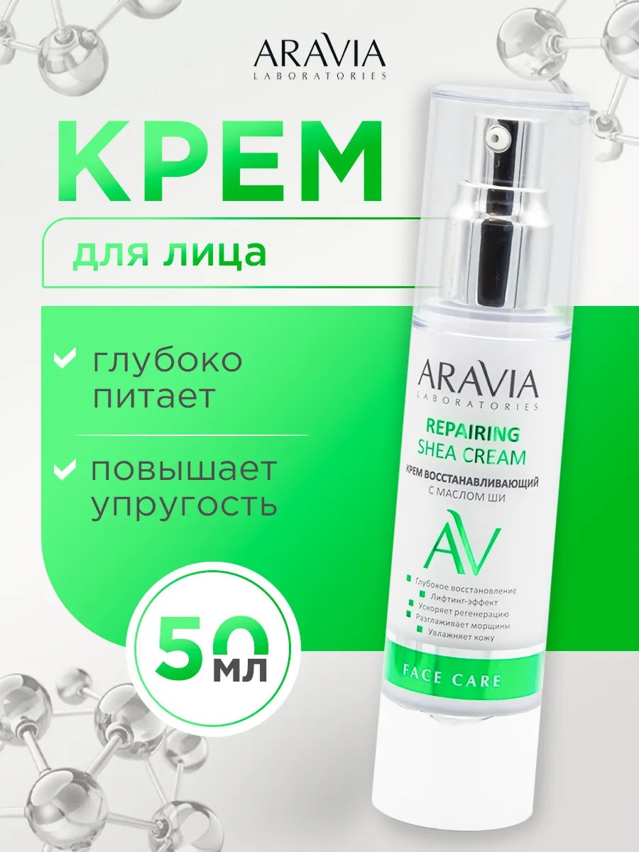 ARAVIA Laboratories Крем восстанавливающий с маслом ши Repairing Shea Cream 50мл. Для всех типов кожи. Нежный крем глубоко питает и восстанавливает кожу, поддерживая ее здоровый вид. Повышает плотность кожи, оказывает эффект лифтинга. Обладает увлажняющим и смягчающим действием. Масло ши обладает выраженными антиоксидантными и регенерирующими свойствами, является действенным средством против старения кожи. Назначение: восстановление кожи. Биоактивный состав: масло ши, экстракт ламинарии, экстракт листьев оливы, лецитин, сквалан, сорбитол. Масло ши — обладает выраженным антиоксидантным действием, стимулирует замедлившиеся процессы метаболизма увядающей кожи и регенерацию клеток. Укрепляет ослабленную кожу, делает ее более плотной и эластичной. Экстракт ламинарии — увлажняет, подтягивает кожу, повышает упругость, тонизирует кожу, ускоряет обмен веществ. Экстракт листьев оливы — омолаживает кожу на клеточном уровне, укрепляет клеточные мембраны, защищает коллаген и эластин — от повреждений и способствует их воспроизводству, придает коже способность противостоять старению, защищает клетки от негативного воздействия свободных радикалов, повышает тонус кожи. Лецитин — смягчает и тонизирует, восстанавливает естественную защиту кожи. Налаживает работу сальных желез, защищает от потери влаги. Устраняет воспаление и раздражение, способствует заживлению микроповреждений. Сквалан — увлажняет и смягчает кожу, защищает от негативного воздействия окружающей среды, борется с преждевременным старением и поддерживает эластичность кожи. Сорбитол — увлажняет и удерживает влагу на поверхности кожи. Рекомендации для использования: для ежедневного использования.