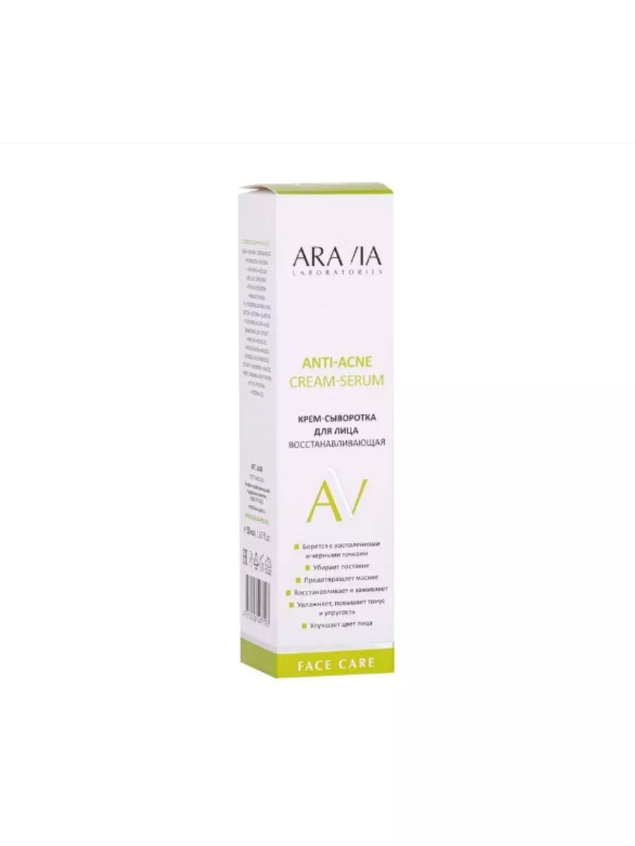ARAVIA Restorative Facial Cream-Serum, 50 ml. This cream-serum is designed for intensive restoration of oily and problematic skin. A complex of active ingredients reduces inflammation, soothes, relieves irritation and flaking, evens out skin texture, and promotes healing. It protects the skin from toxins and environmental influences. It normalizes sebum production, improves complexion, and helps the skin breathe. It combats age spots and post-acne marks. It moisturizes, reduces wrinkles, and improves skin tone and elasticity. Directions: Apply a thin layer of the cream-serum to cleansed skin.