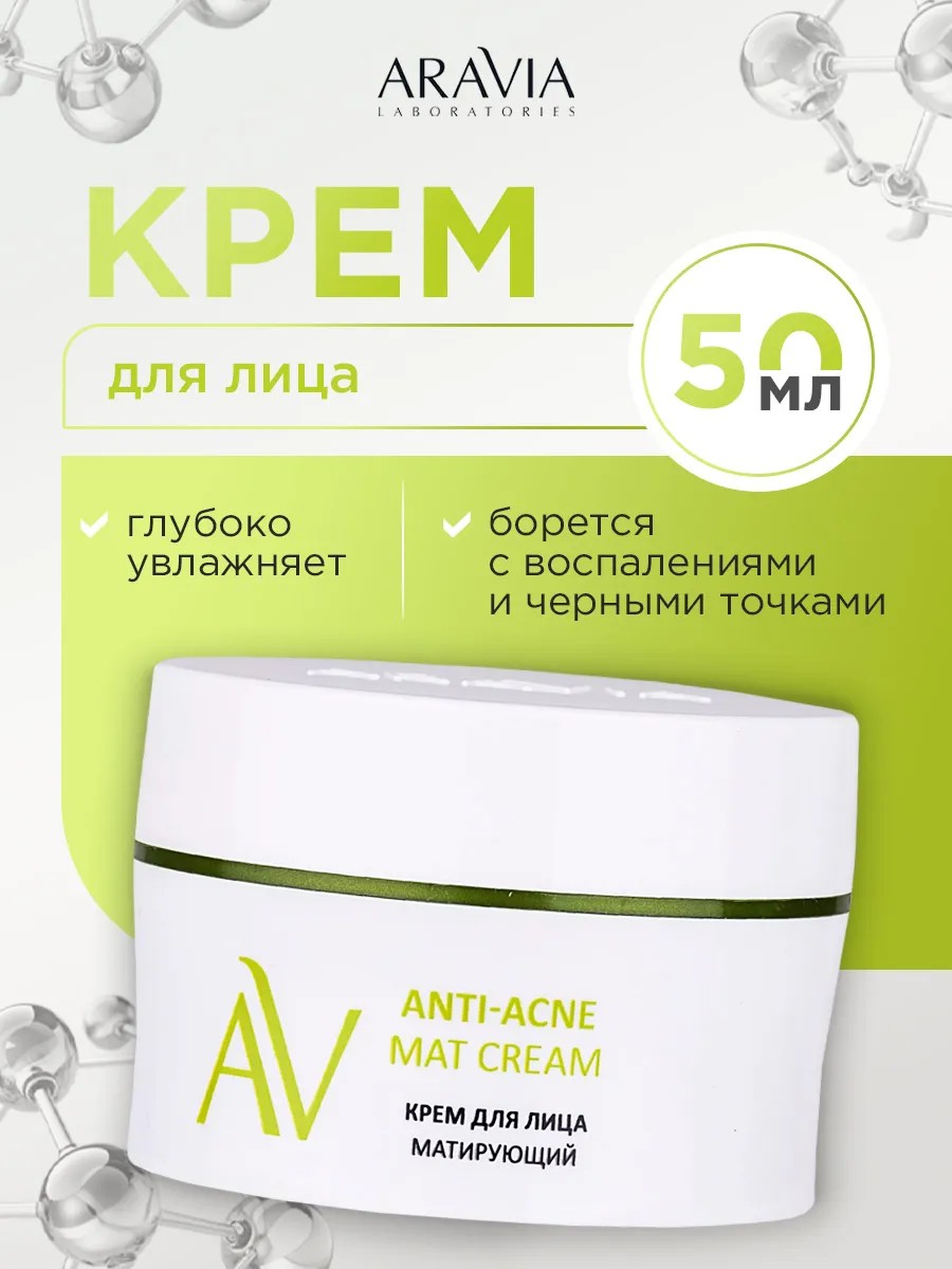 ARAVIA Laboratories Anti-Acne Mat Cream 50ml. This mattifying cream is designed for oily and problematic skin prone to acne. It regulates sebum production, mattifies, and protects against shine. It lightens post-acne spots and evens out skin tone. It leaves skin clean and radiant. It fights inflammation and blackheads and tightens pores. It deeply moisturizes the skin and protects against moisture loss. It makes the skin firm and elastic. It is also suitable for makeup application. Bioactive ingredients: azelaic acid, grape seed oil, and vitamin E. Azelaic acid has a powerful antibacterial effect.