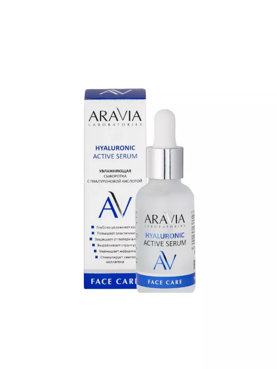 ARAVIA Hyaluronic Acid Moisturizing Facial Serum, 30 ml. This serum intensely and deeply hydrates, improves skin elasticity and firmness, slows the aging process, and smoothes wrinkles. It prevents moisture loss, improves the skin's barrier function, relieves irritation, soothes, and promotes skin healing. It leaves skin radiant.