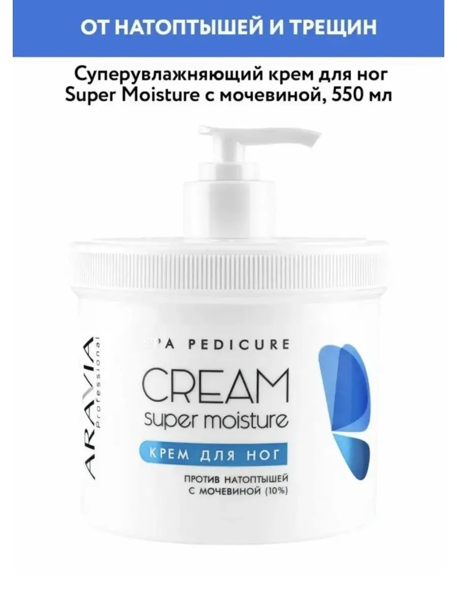 Крем Aravia Professional Super Moisture для ног от натоптышей с мочевиной флакон с дозирующим устройством 550 мл №1.Крем с супер увлажняющим эффектом для очень сухой кожи стоп. Решает проблемы загрубевшей кожи и гиперкератоза. Содержит 10процент мочевины, которая эффективно смягчает кожу стоп, оказывает длительное увлажняющее воздействие, предотвращая появление натоптышей и трещин. Аллантоин в сочетании с натуральным маслом кокоса и авокадо успокаивает, восстанавливает мягкость и эластичность кожи, способствует ее заживлению и регенерации. При регулярном применении является эффективным профилактическим средством от появления мозолей и натоптышей. Рекомендуется для завершающего этапа педикюра