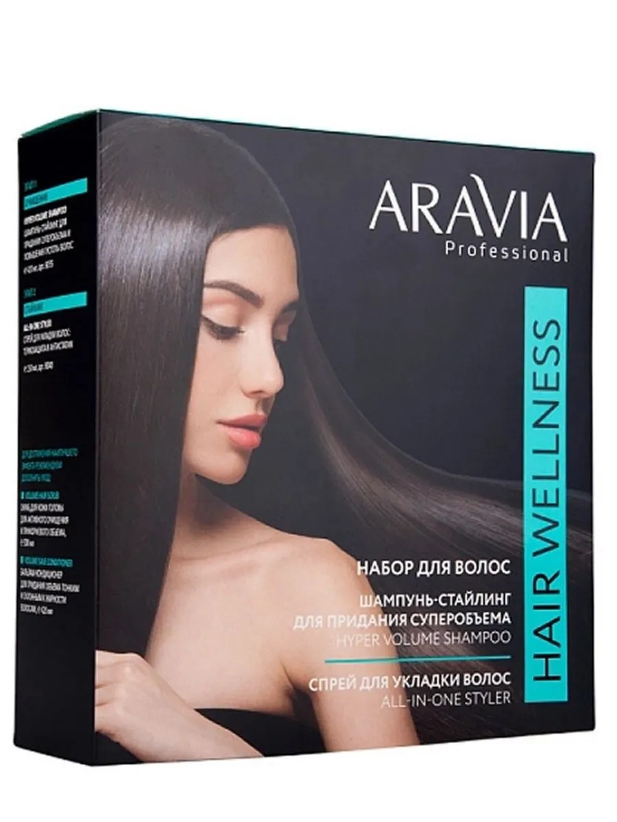 ARAVIA Professional Шампунь-стайлинг для придания суперобъема и повышения густоты волос Hyper Volume Shampoo, 420 мл. Особая формула шампуня с легкой гелевой текстурой разработана специально для создания непревзойденного эффекта двойного объема и повышения качества укладки. При соединении с водой и образовании воздушной пены молекулы Volume-up осаждаются на волосах невесомой вуалью, оказывая кондиционирующее действие и придавая гладкость и блеск, а при последующем высыхании меняют свою структуру, увеличиваясь в размерах и создавая пространство между волосками, чем обеспечивают прическе исключительный объем и густоту без утяжеления. Трегалоза и Д-пантенол обладают мощными увлажняющими и влагоудерживающими свойствами, улучшают расчесывание, повышают эластичность и упругость, облегчая процесс укладки, а также защищая волосы от повреждений и негативного влияния внешних факторов. ARAVIA Professional Спрей для укладки волос: термозащита и антистатик All-In-One Styler, 150 мл. Многофункциональный спрей для создания идеальной подвижной укладки без склеивания. Оказывает мощное термозащитное действие — равномерно распределяет тепло от стайлинговых приборов и предотвращает перегревание волос, предупреждая разрушение кератина и иссушение кутикулы. Контролирует пушистость даже в очень влажной среде, а также обладает выраженным антистатическим эффектом — нивелирует негативное влияние сухого воздуха и устраняет наэлектризованность волос. Создает на прядях невесомый слой, уплотняющий структуру и обеспечивающий ультралегкий фиксирующий эффект при горячей укладке, сохраняя при этом натуральную подвижность волос для максимально естественной и объемной прически. Подходит для текстурирования или оформления локонов.