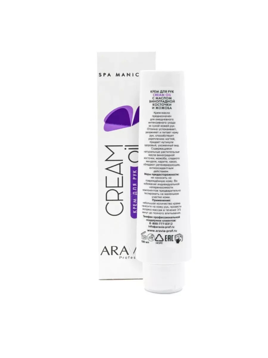 Aravia Крем для рук Cream Oil с маслом виноградной косточки и жожоба, 100 мл, 1 штука. Крем-масло предназначено для проведения расслабляющего массажа кистей рук на завершающем этапе SPA-маникюра. Отлично успокаивает, увлажняет и питает кожу рук, способствует укреплению ногтей, придает кутикуле здоровый, ухоженный вид. Содержащиеся натуральные растительные масла виноградной косточки, жожоба, сладкого миндаля, карите, какао, обладают регенерирующим, антиоксидантным действием. Помогая бороться со свободными радикалами, замедляют процесс увядания кожи. Набор входящих в состав масел: виноградной косточки, жожоба, сладкого миндаля, ши, какао.