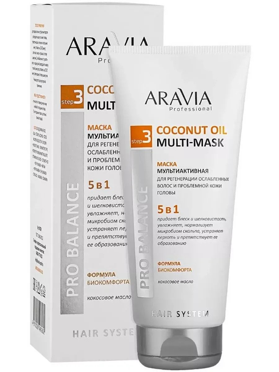 Aravia 5-in-1 Multi-Active Mask for Regenerating Weakened Hair and Problematic Scalp, 200 ml. This multifunctional coconut mask regenerates lifeless, dull hair and problematic scalps prone to dandruff, itching, and redness. Coconut oil is rich in valuable microelements and vitamins A, E, and K. It has high penetrating properties, actively restoring the hair's lipid layer and hydrating it, leaving hair elastic, soft, and silky. Thanks to its high content of a complex of acids: lauric, myristic, palmitic, oleic, and caprylic, coconut oil effectively combats dandruff and itching, soothes inflammation on irritated, problematic scalps, and improves the scalp's microbiome. Regular use of this mask protects the hair structure from damage, adds shine and deeply moisturizes, provides lasting anti-inflammatory and antimicrobial action, eliminating dandruff and normalizing the condition of both oily and dry scalp. Ingredients: Aqua, Cetearyl Alcohol, Cocos Nucifera Seed Butter, Glycerin, Phenoxyethanol, Dipalmitoylethyl Hydroxyethylmonium Methosulfate, Cetrimonium Chloride, Ceteareth-20, Methylparaben, Parfum, Propylparaben, Ethylparaben, Citric Acid, Limonene, Coumarin.