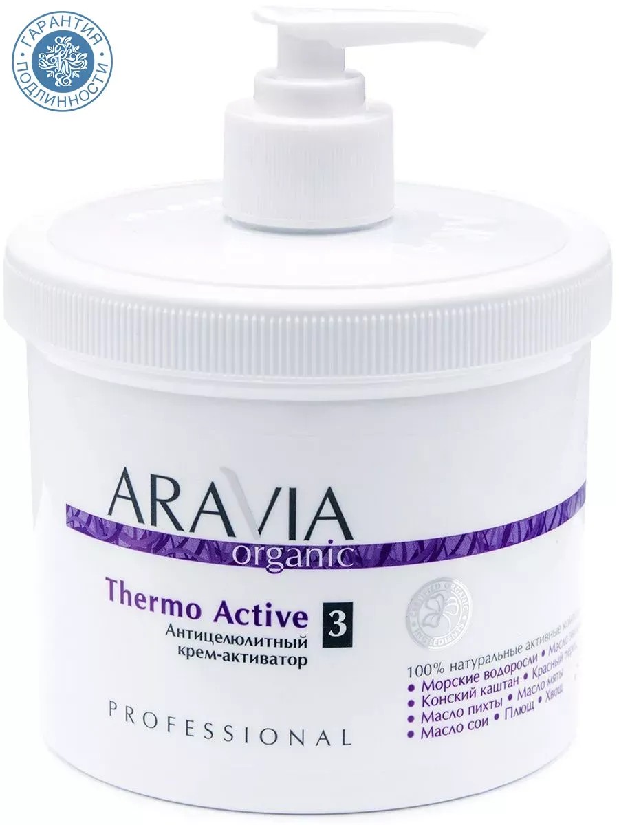 Антицеллюлитный крем-активатор с комфортным для кожи термоактивным эффектом. Обладает мощным жиросжигающим действием. ускоряет обменные процессы в жировой ткани способствует расщеплению жиров и коррекции фигуры проводниковый эффект крема позволяет активным компонентам глубоко проникать в кожу, насыщая её минералами и витаминами Рекомендован при: целлюлит 1-3 стадии застойные явления локальные жировые отложения ПРИМЕНЕНИЕ: После глубокого очищения нанести средство на кожу тела в виде легкой маски. Укрыть пленкой и полотенцем оставить на 5 минут. Снять пленку и втереть остатки средства в кожу легкими массажными движениями. Профессиональный продукт предназначен для комплексного решения проблем кожи тела. Для достижения максимального результата рекомендуется сочетать уход с другими профессиональными средствами линии ARAVIA Organic.