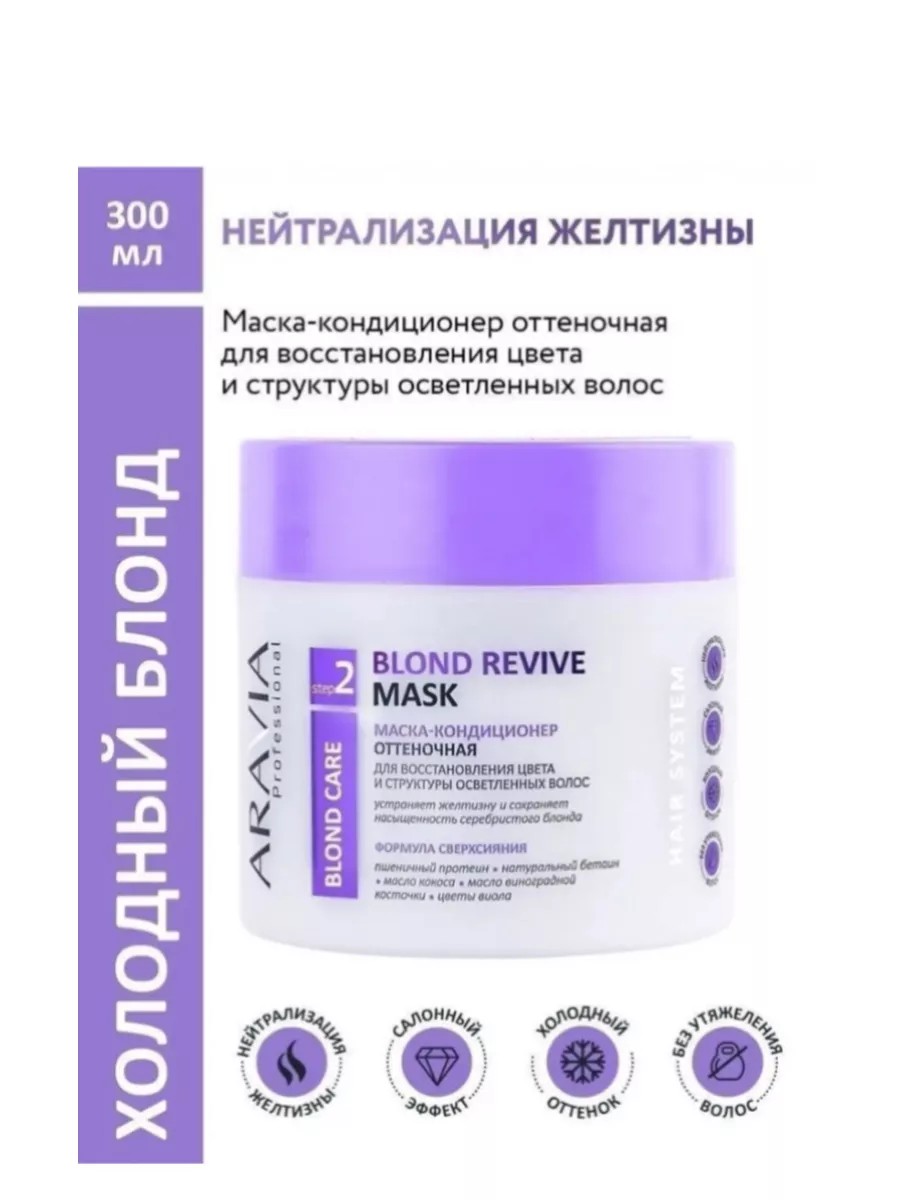 Маска-кондиционер мгновенного действия для ухода за осветленными, обесцвеченными волосами холодных тонов. Благодаря насыщенному фиолетовому пигменту маска усиливает интенсивность холодных оттенков блонд, нейтрализуя нежелательную желтизну. Цветы виола препятствуют вымыванию светлого цвета, сохраняя его насыщенность. Пшеничный протеин глубоко проникает в кортекс волоса, укрепляет и восстанавливает его природную структуру, формирует защиту от ежедневных стрессов во время расчесывания и укладки. Натуральные масла кокоса и виноградной косточки питают волосы ненасыщенными жирными кислотами, делая их более мягкими и послушными. Натуральный бетаин повышает влагоудерживающую способность волоса, повышая эластичность и гибкость поврежденных волос, тем самым предотвращая ломкость и сечение. Маска-кондиционер наиболее эффективна в сочетании с оттеночным шампунем для холодных оттенков блонд. Результат-блестящий холодный оттенок блонд и здоровые сияющие волосы.