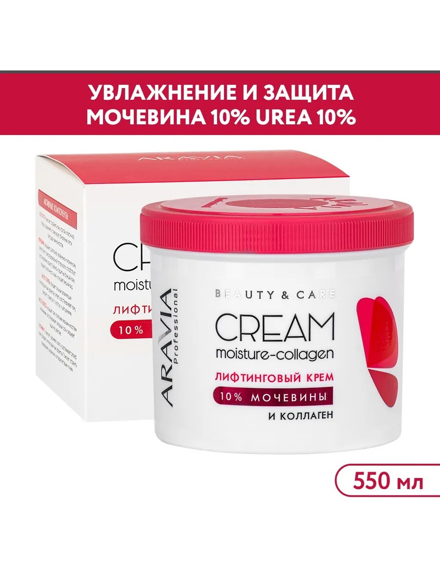 ARAVIA Professional Lifting Face Cream with Collagen and Urea, 550 ml. This rich, light-textured cream, based on a collagen and urea complex (10%), is designed for dry, dehydrated skin showing signs of aging. The super-moisturizing formula instantly improves the skin's appearance and condition, eliminates tightness and flaking, and provides a lifting effect, significantly improving skin tone. Urea, a unique component of the natural moisturizing factor (NMF), is closely related to skin and provides a powerful moisturizing effect. Collagen accelerates regeneration and evens out microrelief, promotes restoration of skin structure, and improves elasticity and firmness. This universal cream is designed for the face and body. Ingredients: Aqua, Hydroxyethyl Urea, Cocos Nucifera Seed Butter, Cetearyl Alcohol, Glycerin, Potassium Cetyl Phosphate, Cetyl Alcohol, Olea Europaea (Olive) Fruit Oil, Phenoxyethanol, Ceteareth - 20, Methylparaben, Parfum, Hydrolyzed Collagen, Tocopheryl Acetate, Propylparaben, Ethylparaben, Limonene, Linalool, Citral. How to use: Apply the cream to dry skin of the face and body until completely absorbed. Volume: 550; Skin type: For all skin types; Area of use: Face; Ingredients: Aqua, Hydroxyethyl Urea, Cocos Nucifera Seed Butter, Cetearyl Alcohol, Glycerin, Potassium Cetyl Phosphate, Cetyl Alcohol, Olea Europaea (Olive) Fruit Oil, Phenoxyethanol, Ceteareth - 20, Methylparaben, Parfum, Hydrolyzed Collagen, Tocopheryl Acetate, Propylparaben, Ethylparaben, Limonene, Linalool, Citral;
