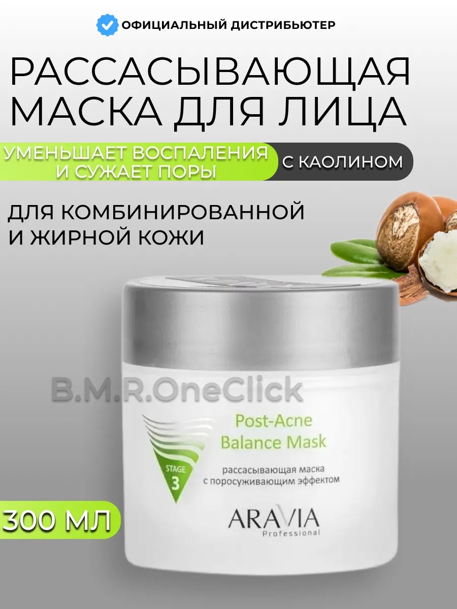 Aravia Professional Post-Acne Balance Mask with a pore-tightening effect, 300 ml. The Aravia Post-Acne Balance mask is designed to effectively combat imperfections of oily and problematic skin prone to acne, enlarged pores, excess sebum secretion, comedones, and post-acne. The mask has a keratolytic effect, promotes the rapid removal of dead skin cells, cleanses comedones, and prevents the formation of new ones. It helps eliminate swelling and stagnant spots, deeply cleanses, tones and tightens pores, and activates metabolic processes. The presence of sulfur and badyagi gives the mask an active resorption effect, which prevents congestion, the formation of sebaceous plugs, improves microcirculation and skin tone. How to use: Apply a thick layer to prepared skin. Leave on for 10-20 minutes. Rinse off any remaining mask with warm water. Precautions: Do not apply to broken skin or eyes. If contact occurs, rinse thoroughly with water. Test on a small area of skin before use. Active ingredients: Kaolin, badyagi, sulfur.