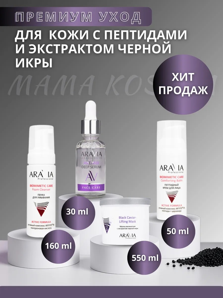 | Комплектация | Пептидный крем для лица Comforting Balm, 50 мл; Маска альгинатная с экстрактом черной икры Black Caviar-Lifting, 550 мл; Омолаживающая сыворотка с пептидами ANTI-AGE DEEP SERUM, 30 мл; Пенка для умывания Foam Cleanser, 160 мл |