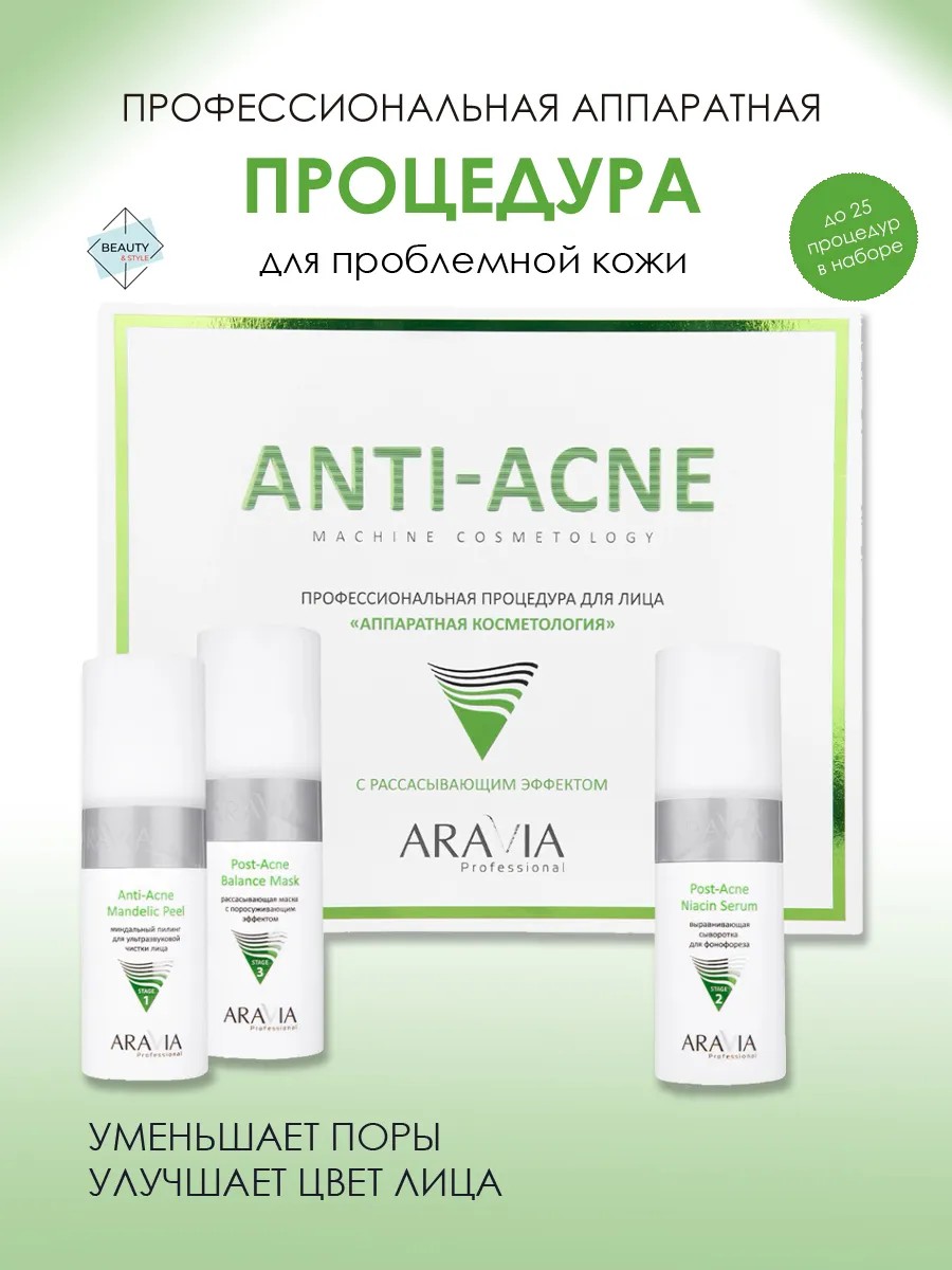 Профессиональная процедура для лица «Anti-Acne» представляет собой готовую процедуру для аппаратной косметологии с целью решения проблем жирной кожи, склонной к появлению несовершенств, с признаками постакне, расширенными порами, избыточным выделением себума. Сочетание методик ультразвуковой чистки миндальным пилингом, фонофореза с применением выравнивающей сыворотки на основе ниацинамида и рассасывающей маски с бадягой, позволяет улучшить микроциркуляцию, запустить метаболические процессы, глубоко очистить и устранить закупорку выводных протоков сальных желез, запустить процессы выработки собственной гиалуроновой кислоты. Комплексное действие средств процедуры с аппаратными методиками ускоряет разрешение воспалительных элементов и застойных пятен, выравнивает цвет лица, снимает отечность, сужает поры, нивелирует симптомы постакне. Аппаратные методики: ультразвуковая чистка, фонофорез