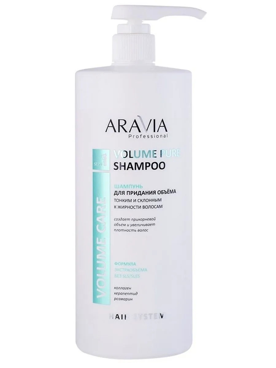 ARAVIA PROFESSIONAL ШАМПУНЬ ДЛЯ ПРИДАНИЯ ОБЪЁМА ТОНКИМ И СКЛОННЫМ К ЖИРНОСТИ ВОЛОСАМ 1000МЛARAVIA Professional шампунь для придания объема тонким и склонным к жирности волосам Volume Pure Shampoo.Внешний вид: Гелеобразная текстура от прозрачного до светло-бежевого цвета с легким, освежающим запахом.Легкая формула шампуня с коллагеном для бережного очищения тонких, лишенных объема и склонных к жирности волос.Тщательно удаляет излишки себума, внешние загрязнения и остатки средств укладки, не нарушая естественный защитный барьер волос и кожи головы. Благодаря содержанию коллагена волосы приподнимаются в прикорневой зоне, надолго сохраняя объем и обеспечивая легкость при укладке.Керапептид уплотняет структуру волос, восстанавливает их целостность, прочность, делает их более густыми, наполняя силой и блеском.Гидролат розмарина пробуждает волосяные луковицы, ускоряя рост волос, и нормализует сальную секрецию для длительной чистоты и свежести.Результат: Шампунь в комплексе со средствами для объема волос имеет накопительный эффект, наполнит слабые волосы жизненной силой, сиянием и красотой.00