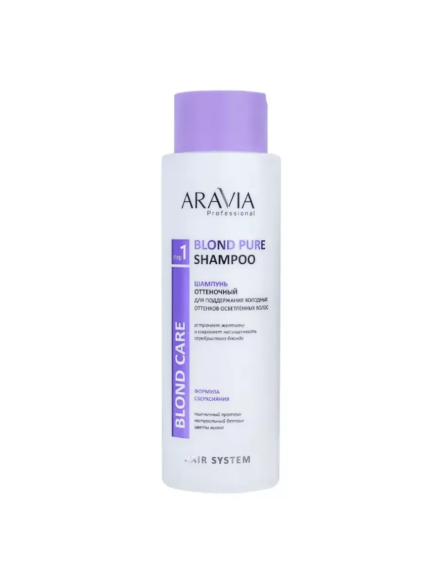 Aravia Professional Шампунь оттеночный для поддержания холодных оттенков, 400 мл. ПРИМЕНЕНИЕ: Нанесите шампунь на влажные волосы, распределите массирующими движениями от корней до кончиков. Тщательно смойте остатки шампуня обильным количеством теплой воды. При необходимости повторить. Рекомендуется использовать перчатки. Шампунь для мягкого бережного очищения осветленных, обесцвеченных волос, препятствующий пересушиванию, пожелтению и выцветанию холодного блонда. Благодаря интенсивному фиолетовому пигменту шампунь нейтрализует нежелательную желтизну и придает цвету благородный серебристый тон. Пшеничный протеин глубоко проникает в кортекс волоса, укрепляет и восстанавливает его природную структуру, формирует «защитный экран» от ежедневных стрессов во время расчесывания и укладки. Цветы виола препятствуют вымыванию цвета, сохраняя насыщенность светлых оттенков. Натуральный бетаин повышает влагоудерживающую способность волоса, повышая эластичность и гибкость поврежденных волос, тем самым предотвращая ломкость и сечение. Шампунь наиболее эффективен в сочетании с оттеночной маской-кондиционером Blond Revive для холодных оттенков блонд. Результат блестящий холодный оттенок блонд и здоровые сияющие волосы. Назначение: шампунь для мягкого очищения волос и кожи головы, нейтрализации желтизны и придания холодного оттенка светлому блонду.