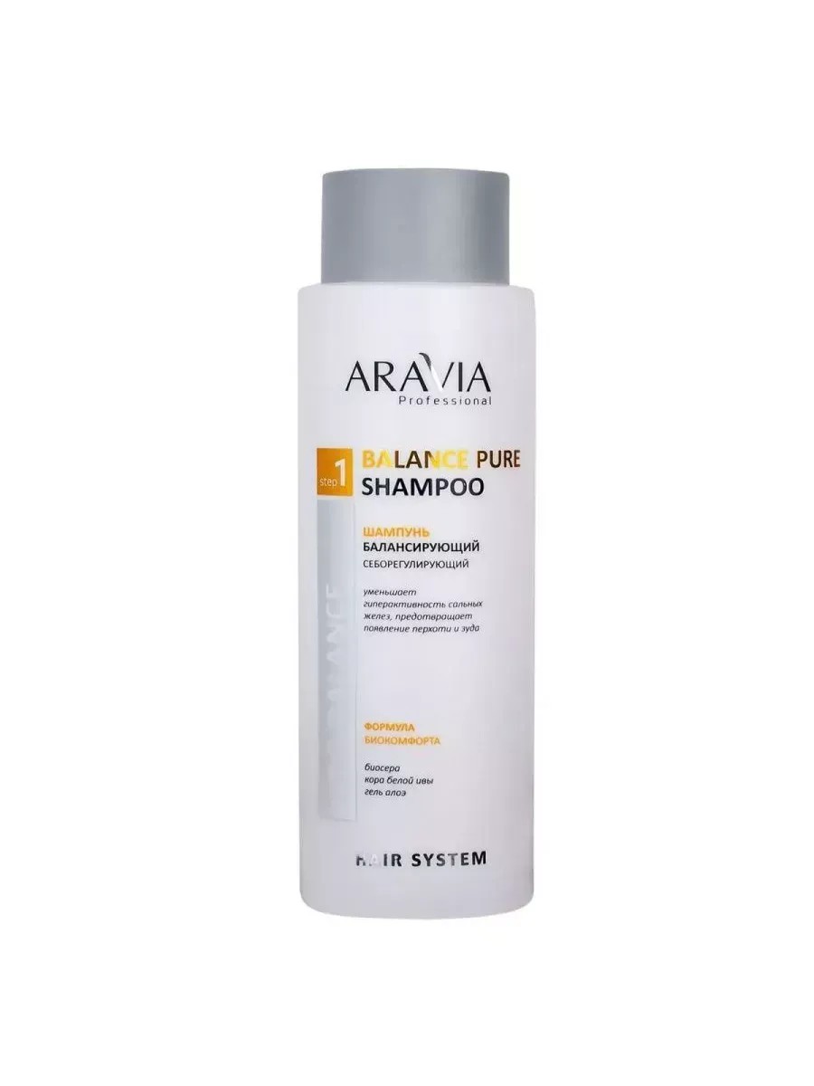 Aravia Шампунь балансирующий себорегулирующий Balance Pure Shampoo, 400 мл, 1 штука. Профессиональный шампунь для чувствительной, проблемной кожи головы, склонной к повышенному выделению кожного сала. Средство тщательно очищает скальп от загрязнений и себума, а также удаляет ороговевшие чешуйки кожи, активизируя рост здоровых волос. Благодаря себорегулирующему, противовоспалительному и антибактериальному свойствам биосера устраняет дисбаланс микроорганизмов, восстанавливает барьерные свойства кожи, препятствуя появлению перхоти, зуда и запаха. Кора белой ивы — источник салициловой кислоты, — снижает гиперактивность сальных желез, помогает продлить чистоту и свежесть волос, увеличивая интервал между мытьем волос. Гель алоэ обладает успокаивающим эффектом, снимает чувство стянутости, увлажняет волосы и кожу головы, препятствуя их пересушиванию. В результате применения шампуня кожа головы снова обретает комфортные ощущения, и волосы становятся более сильными и здоровыми. Способ применения: Нанести шампунь на влажные волосы, распределить массирующими движениями от корней до кончиков. Тщательно смыть остатки шампуня обильным количеством теплой воды. При необходимости повторить. Биоактивный состав: Биосера — мощный антиоксидант, устраняющий раздражение, зуд и перхоть на коже головы, предотвращает преждевременное выпадение и активизирует рост новых здоровых волос, обладает выраженным себорегулирующим действием, борется с излишней жирностью скальпа и волос, продлевая тем самым свежесть и комфортные ощущения после мытья головы. Кора белой ивы — богата ценными феноловыми соединениями, дубильными веществами и производными салициловой кислоты, благодаря чему обладает противовоспалительным действием, благотворно влияя на чувствительную, проблемную кожу головы. Гель алоэ — является укрепляющим, регенерирующим и противогрибковым компонентом, насыщающим волосы и кожу головы влагой, питающим волосяные луковицы и придающим прическе естественный здоровый блеск.