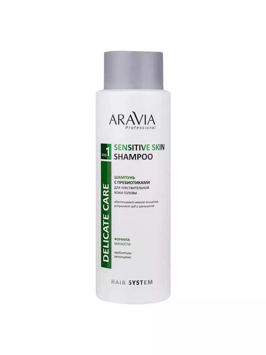 ARAVIA Professional Prebiotic Shampoo for Sensitive Scalp, 400ml. This soothing formula gently cleanses sensitive scalps. A prebiotic blend of chicory root, sugar beet, and wheatgrass restores the scalp's microbiota balance, protects the scalp from damage and microcracks, and supports beneficial microflora. Prevents tingling, burning, and tightness. Piroctone olamine has a broad spectrum of action, effectively reducing flaking and relieving itching and irritation of the scalp. Arabia Shampoo improves scalp condition, soothes, reduces sensitivity, and prevents flaking. Intended use: This shampoo cleanses sensitive scalps, restores and moisturizes, and eliminates tightness, flaking, and itching.