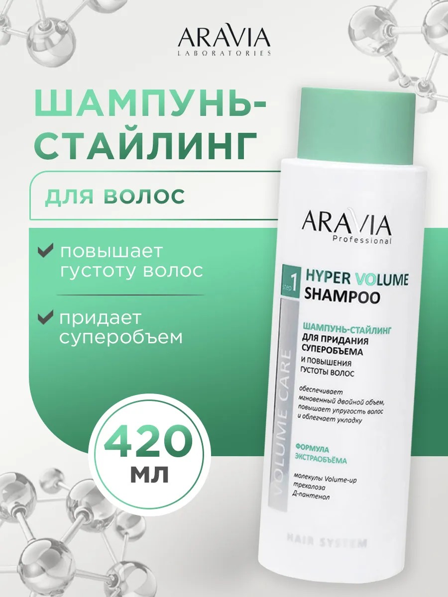 ARAVIA Professional Super-Volume and Thickening Styling Shampoo, 400ml. Skin type: All skin types. Texture: Gel. This shampoo's special formula with a light gel texture was developed to create an unrivaled double-volume effect and enhance styling. When combined with water to form an airy lather, volume-up molecules settle on the hair like a weightless veil, providing conditioning and imparting smoothness and shine. Upon drying, they change their structure, increasing in size and creating space between the hair strands, providing exceptional volume and thickness without weighing down the hair. Trehalose and D-panthenol have powerful moisturizing and moisture-retaining properties, improve combing, increase elasticity and firmness, making styling easier, and protect the hair from damage and the negative effects of external factors. Purpose: shampoo for cleansing, creating double volume, moisturizing, conditioning, facilitating styling. Recommended for use: for professional and home use. Bioactive composition: volume-up molecules, trehalose, D-panthenol. - Volume-up molecules are invisible molecules for visible, impressive and weightless volume. They settle on the surface of the hair, separate it and create space between it, without weighing it down and instantly increasing volume, providing additional care and conditioning. - Trehalose is a natural saccharide with the unique ability to preserve the structure of hair protein, moisturizes and protects strands from drying out, protects against damage and adverse environmental influences. - D-panthenol conditions and restores hair, gives elasticity, flexibility and rich shine, protects against mechanical and chemical damage, compacts and thickens the hair fiber, providing additional volume.