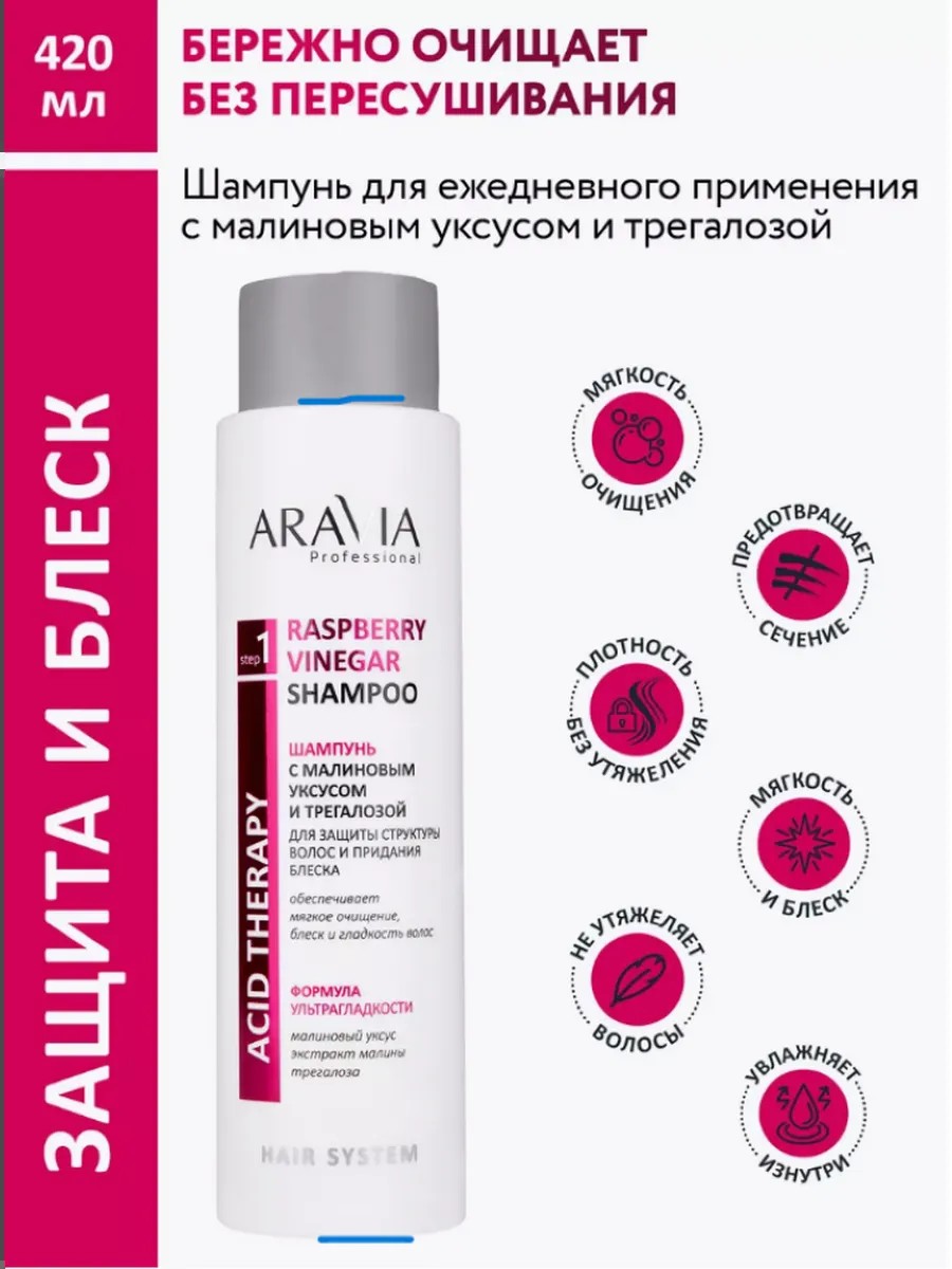 Формула шампуня с уксусом и активными компонентами мягко очищает волосы, удаляя внешние загрязнения и остатки средств укладки, нейтрализуя жесткость воды при мытье. Трегалоза в составе шампуня, благодаря своей уникальной способности удерживать влагу даже в самых экстремальных условиях, обеспечивает длительное поддержание естественного уровня гидратации кожи и волос. Экстракт малины способствует улучшению структуры локонов, возвращая им здоровый вид, предотвращая ломкость и сечение.