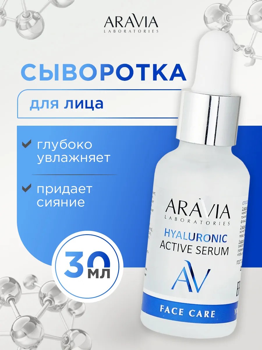 ARAVIA Laboratories Hyaluronic Active Serum 30ml. For all skin types. The serum intensely and deeply moisturizes, improves elasticity and firmness, slows the aging process, and smoothes wrinkles. Prevents moisture loss, improves the skin's protective functions, relieves irritation, soothes, and promotes skin healing. Makes skin radiant. Purpose: intensive skin care, moisturizing, improving skin elasticity. Bioactive ingredients: hyaluronic acid, vitamin B3, urea, glycerin, allantoin, D-panthenol, betaine. Hyaluronic acid deeply moisturizes the skin, increases elasticity, evens out its structure and texture, and prevents moisture loss. Reduces wrinkles. Softens and smoothes the skin. Vitamin B3 (niacinamide) stimulates collagen synthesis and improves the skin's barrier function, helping to reduce transepidermal water loss and pigmentation. Urea instantly moisturizes the skin. Retains moisture in the deep layers of the epidermis. Stimulates epidermal cell renewal and strengthens the skin's protective barrier. Relieves tightness and eliminates hyperkeratosis. Glycerin deeply moisturizes. Promotes better penetration of moisture into the deeper layers of the skin. Promotes rejuvenation. Allantoin promotes healing and skin restoration, protects against the negative effects of free radicals and slows the appearance of wrinkles. Relieves irritation, soothes, refreshes, and prevents tightness and discomfort. D-panthenol has a moisturizing, healing, softening, and smoothing effect. Makes the skin more elastic and has a calming effect. Betaine actively moisturizes, relieves irritation, and improves the appearance of the skin. Recommended for daily use.