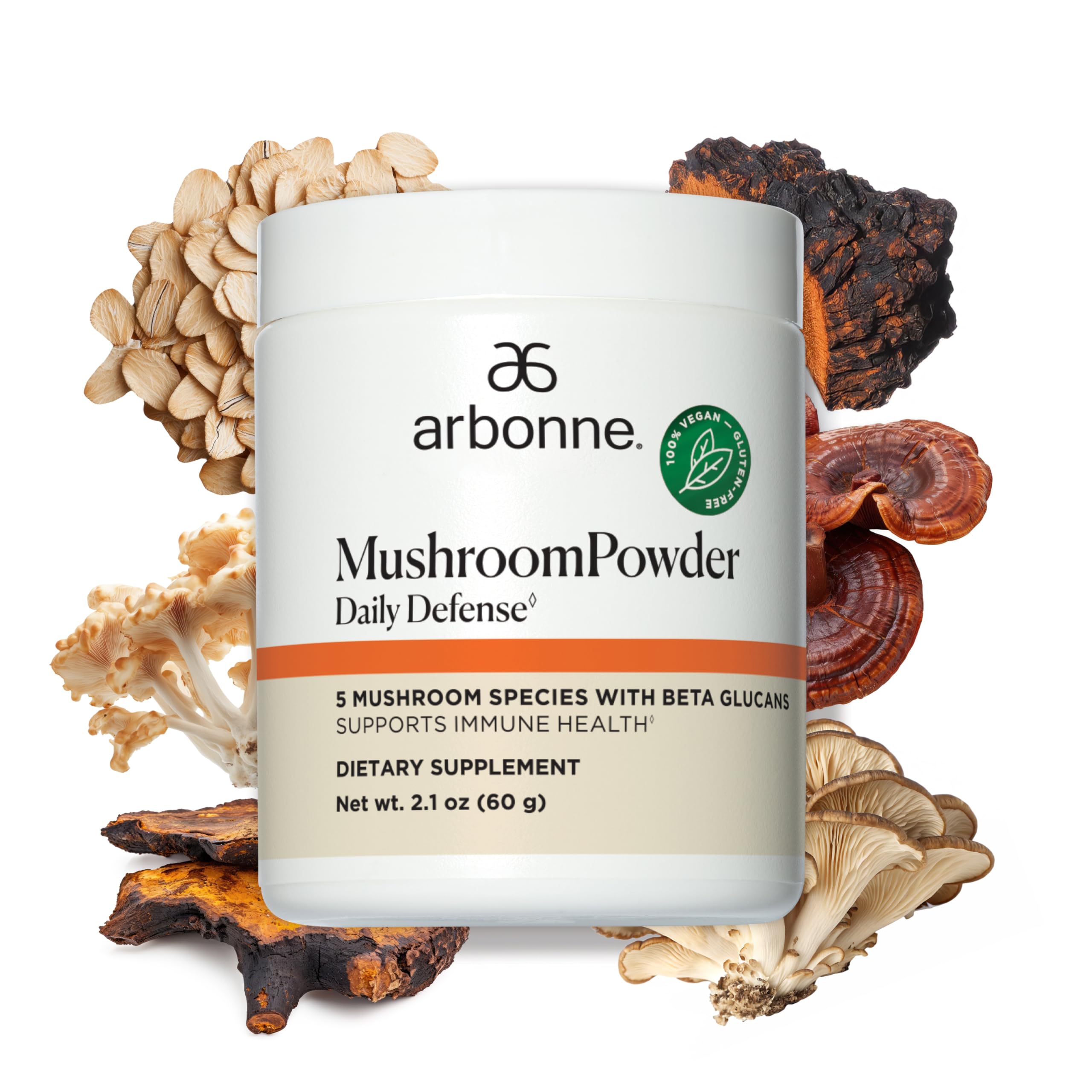 Arbonne Mushroom Powder Daily Defense - Daily Mushroom Supplement Powder Superblend that Supports Immune and Cognitive Health, 100 Organic Mushrooms, 2.1 oz A daily superblend of mushrooms that supports your immune system, helps you adapt to stress, and supports cognitive function! With only 5 ingredients, this mushroom blend powder derived from 100 organic mushrooms contains standardized bioactive beta glucans. With a uniquely selected mushroom blend to support immune response on a cellular level, this mild-tasting powder supports the body's cells to respond to environmental stressors. It features Reishi with adaptogenic properties to help alleviate stress, and Lion's Mane powder to help support healthy cognitive function. With its mild, earthy flavor, this real mushroom powder blends easily into smoothies, coffee, mushroom tea, oatmeal, or your favorite beverage. Whether you're looking to support mental clarity, your body's response to every day stress, or support your immune system, these mushroom supplements offer a convenient and powerful addition to your daily wellness routine. This mushroom extract supplement provides a simple way to support your body's natural defenses and cognitive health, making it an excellent choice for anyone seeking an effective mushroom powder, Lion Mane mushroom supplement, or an organic mushroom supplement. Third-party tested, free of fillers, binders, additives. These statements have not been evaluated by the Food and Drug Administration. This product is not intended to diagnose, treat, cure or prevent any disease. Not intended to prevent, treat or cure COVID-19Versatile Easy to Use - Add ½ teaspoon (2 g) to your favorite hot or cold food or beverage such as smoothies, coffee or oatmeal. Do not exceed the recommended intake of ½ teaspoon per day. Real Mushroom Mix - Supplement made from real mushrooms and free of fillers, binders, additives, starch, mycelium, or grain, and third-party tested for purity and quality. Immune System Boost - This mushrooms supplement is formulated with bioactive beta-glucans to modulate the immune system at a cellular level, supporting the body's response to environmental stressors. Adaptogenic Mushrooms Benefits - Includes Reishi for stress reduction and Lions Mane Powder to support mental clarity and cognitive function, and support the body's ability to adapt to life's daily stressors. Lifestyle Support - A blend of organic mushrooms including Shiitake, Chaga, Reishi, Lion's Mane, and Maitake to support immune health, help manage stress, and cognitive function.