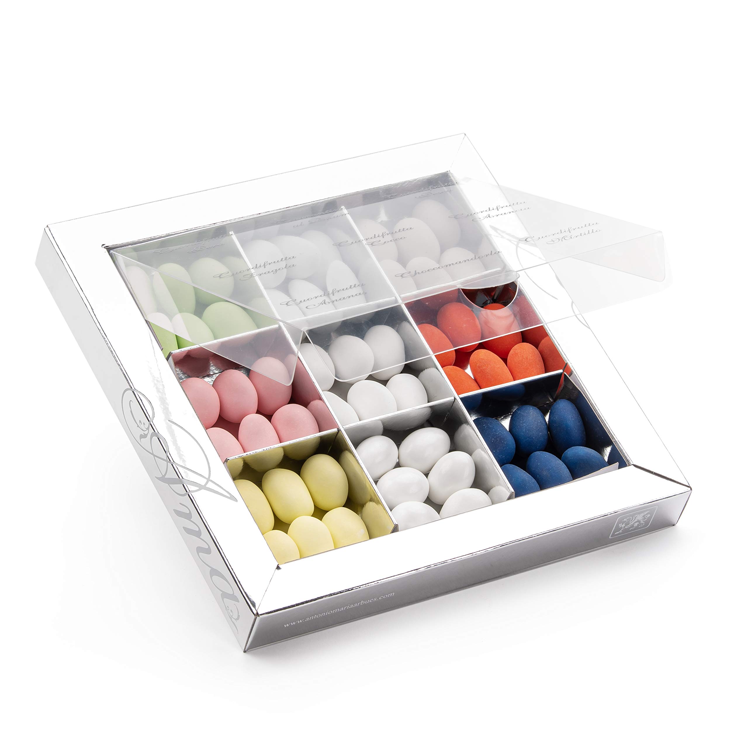 A selection of fine confectionery, presented in an elegant and refined 9-compartment tray. Perfect as a centerpiece or for creating a sugared almond favor for a wedding, baby shower, christening, 18th birthday, graduation party, or any other occasion. An excellent and elegant gift idea, or an exclusive favor box, suitable for all occasions. Delivery includes 300g of sugared almonds in the following flavors: Fruit Heart, Pear, Rum Croquettes – Peach Fruit Heart, Strawberry Fruit Heart, Coconut Fruit Heart – Orange Fruit Heart – Pineapple Fruit Heart – Chocomandorla – Blueberry Fruit Heart. An elegant gift idea, perfect for treating yourself or offering a generous selection of exquisite sugared almonds, suitable for all occasions. Ingredients Outer coating: sugar. Various fillings inside: dark chocolate (cocoa mass, sugar, cocoa butter, emulsifier: soy lecithin, natural vanilla flavoring), white chocolate (sugar, cocoa mass, whole milk powder, whey powder, skimmed milk powder, emulsifier: soy lecithin, natural vanilla flavoring), glucose syrup, pectin, citric acid, todextrin, almonds, alcohol, flavorings. Colors: E131-132-102 -110-124 -151-171. Glazing agent: carnauba wax. Gluten-free. Store in a cool, dry place, max 20 C. INSTRUCTIONS FOR USE Consume in moderation. This product contains ingredients that may cause allergies. Keep out of reach of children.Dragées Arbues artisanales avec garniture en 9 saveurs assorties, 300 g, plateau de dégustation, dragée, idée cadeau, bonbonnièreDESCRIPTION DU PRODUIT DESCRIPTION DU PRODUIT Dégustation de fin de confiserie, présentée dans un plateau à 9 compartiments, à l'aspect élégant et raffiné. Parfait comme centre de table ou pour composer une dragée pour un mariage, une naissance de bébé ou un baptême, pour un 18ème anniversaire, une fête de remise de diplôme et pour toute autre occasion ou événement. Excellente et élégante idée cadeau, ou comme bonbonnière exclusive, adaptée à toutes les occasions. La livraison comprend 300 g de dragées, dans les saveurs : cœur de fruits, poire, croquettes au rhum – cœur de fruits de pêche, cœur de fruits fraise, cœur de fruits noix de coco – cœur de fruits orange – cœur de fruits ananas – Choccomandorla – Cuordifruit myrtille. Élégante idée cadeau, elle est parfaite pour s'offrir et pour offrir une riche dégustation de dragées exquises, adaptée à toutes les occasions. Ingrédients Revêtement extérieur : sucre. Remplissage divers intérieur : chocolat noir (pâte de cacao, sucre, beurre de cacao, émulsifiant lécithine de SOIA, arôme naturel de vanille) chocolat blanc (sucre, pâte de cacao, lait entier en poudre, sérum de lait en poudre, lait écrémé en poudre, émulsifiant lécithine de SOIA, arôme naturel de vanille), sirop de glucose, pectine, pectine, acide citrique, malade. Todextrine, amandes, alcool, arômes. Colorants : E131-132-102 -110-124 -151-171 Agent de revêtement: cire carnauba Ne contient pas de gluten. Conserver dans un endroit frais et sec, max 20 C MODE D'EMPLOI Consommer avec modération. Ce produit contient des ingrédients qui peuvent causer des allergies. Tenir hors de portée des enfants.