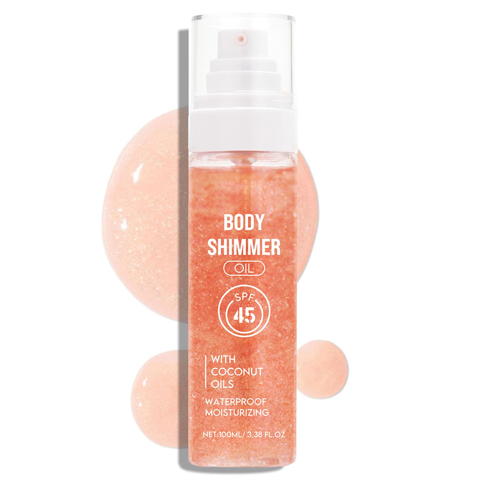 [Usage Suggestions]: Take an appropriate amount of shimmer body oil in your palm and apply it evenly to your skin. Use it 15 minutes before going out and reapply it every 2 hours. You can get sun protection throughout the day. [Non Greasy]: Sunscreen body oil melts on the skin without being sticky. It is refreshing and can be quickly absorbed by the skin. It is suitable for oily or combination oily skin to use in summer without any pressure. [Moisturize Skin]: Glow body oil is enriched with avocado oil, coconut oil and vitamin E. It deeply moisturizes dry skin, improves roughness and peeling, and its antioxidant components combat free radicals. Glow oil SPF 45 also provides sun protection and repairs sun damage. The more you use it, the smoother your skin becomes. [Broad Spectrum SPF 45]: Body glow oil SPF 45 offers high sun protection against UVA UVB, providing outstanding sun protection. It is suitable for commuting, outdoor sports or beach vacations, reduce sunburn and premature skin aging, and keeping the skin always under protective protection. [Shimmer Body Oil]: Adding gold mica to the body glow oil can enhance the natural luster of your body. Applying it to the collarbone, shoulders and neck will make the contour more three-dimensional. The sunscreen body oil can be used as a daily body highlight or a base before makeup, allowing your skin to glow in the sun.