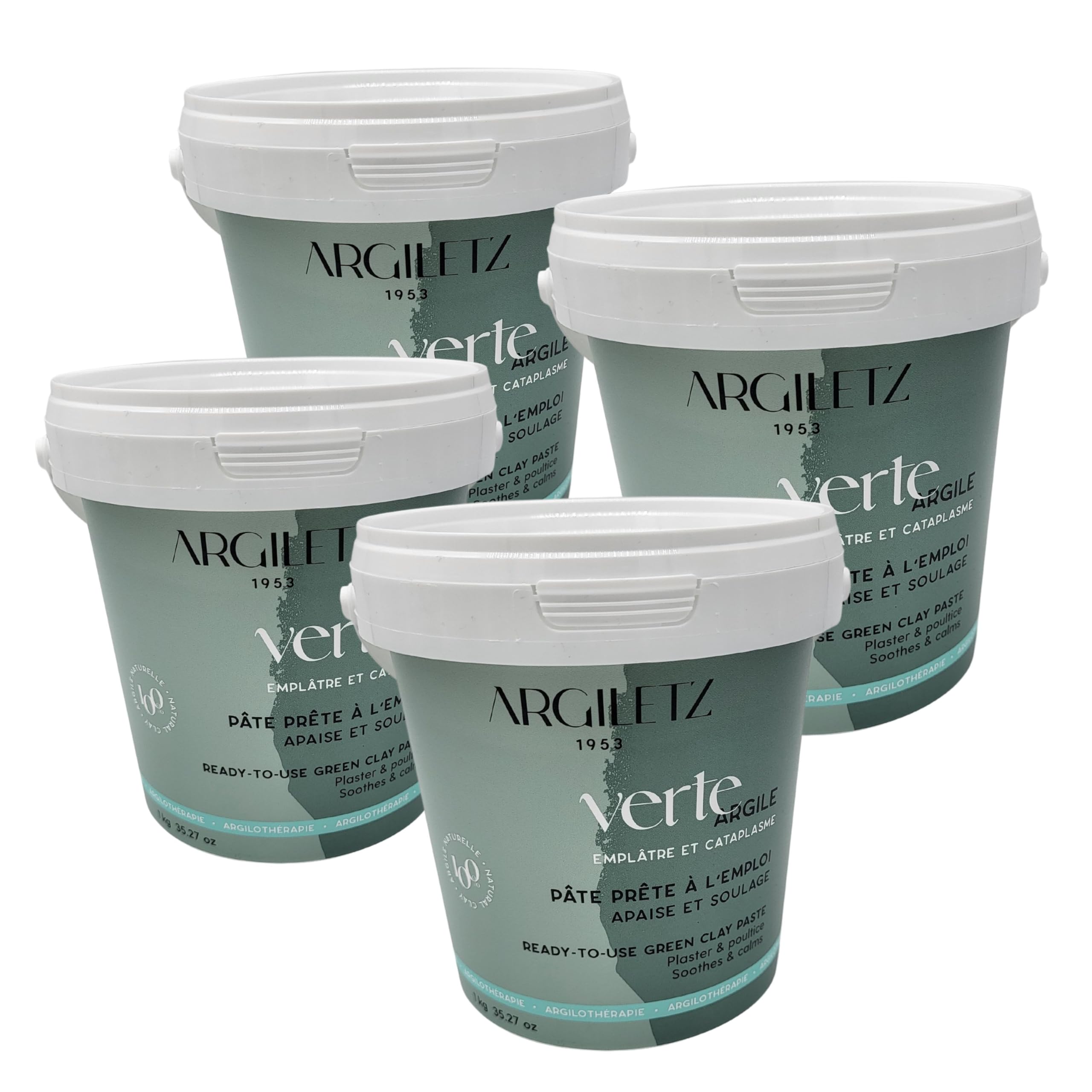 ARGILETZ - 4 x 1kg jars of green clay - ready-to-use paste - DISTRIBUTED BY ARCILIA - ARGILETZ SUN-DRIED CLAY - PLASTER, POULTRY, FACE AND HAIR BEAUTY MASK, CLAY BATH AND TREATMENT - Made in France Exceptionally rich in rare minerals beneficial to your body and rigorously selected, this illite green clay paste is suitable for all your applications. Clay plasters poultices (for treatments, joint pain, muscle pain. Relieves pain related to osteoarthritis, sprains, rheumatism, etc.) Purifying green clay face mask. Perfect for normal to oily skin. Green clay deeply cleanses, remineralizes, and soothes inflammation associated with acne and blemishes. Green clay is also perfect for balancing all skin types. Hair mask: Green clay applied as a mask to the hair and scalp is perfect for absorbing excess sebum from oily hair and purifying it. Clay has absorbent properties (for cleansing) and remineralizing properties to contribute to skin regeneration and better healing. THE ARGILETZ NATURE QUALITY CHARTER: 100 natural clay, Guaranteed sun-dried, Colorant-free, preservative-free, Non-ionized and non-irradiated, Respectful of people and nature, Extracted, dried, and packaged in France INGREDIENTS: Illite, aqua. INSTRUCTIONS FOR USE: As a poultice or compress, apply 1 to 2 cm of clay directly to the affected area and leave for 1 to 2 hours. For other applications, place 2 cm of green clay paste directly onto a thin cloth. Fold the four corners. Apply this compress directly to the desired area. In both casesQUALITY ? ISO 9001 certified product Product manufactured with respect for people and nature. NATURAL ? 100 natural clay Sun-dried Subjected to numerous controls. MULTI-PURPOSE ? Facial beauty mask Hair mask Soothing treatment.(ARCILIA) Argiletz - Lot de 4 pots - Argile Verte - 1kg - Prête à l'emploiDESCRIPTION DU PRODUIT ARGILETZ- 4 pots d'argile verte 1kg - pâte prête à l'emploi - DISTRIBUE PAR ARCILIA - ARGILE SECHEE AU SOLEIL ARGILETZ - CATAPLASME, EMPLATRE, MASQUE SOIN BEAUTE VISAGE, CHEVEUX, BAIN D'ARGILE ET CURE – Fabriqué en France Exceptionnellement riche en minéraux rares utiles à votre organisme et rigoureusement sélectionnée, cette pâte d'argile verte illite s'adapte à toutes vos applications. Emplâtres cataplasmes à l'argile (pour cures, douleurs articulaires, douleurs musculaires. Soulager les douleurs liées à l'arthrose, une entorse, du rhumatisme…) Masque visage purifiant à l'argile verte. Parfait pour les peaux normales à grasses. L'argile verte nettoie en profondeur, reminéralise, calme les inflammations liées à l'acné et les boutons. L'argile verte est aussi parfaite pour équilibrer tous les types de peaux. Masque pour cheveux : l'argile verte en masque sur les cheveux et le cuir chevelu est parfait pour absorber l'excès de sébum sur les cheveux gras et les purifier. L'argile a des propriétés absorbantes (pour nettoyer) et des propriétés reminéralisantes pour contribuer à la régénération de la peau et une meilleure cicatrisation. LA CHARTE QUALITE NATURE ARGILETZ: Argile 100 naturelle, Garantie séchée au soleil, Sans colorant, sans conservateur, Non ionisée et non irradiée, Respectueuse de l'homme et de la nature, Extraite, séchée et conditionnée en France INGREDIENTS: Illite, aqua. MODE D'EMPLOI: En cataplasme ou emplâtre, appliquer directement 1 à 2 cm d'argile sur la zone sensible et laisser agir 1 à 2 heures. Pour d'autres applications, déposer directement 2 cm de pâte d'argile verte sur un linge fin. Replier les 4 coins. Appliquer cet emplâtre directement sur l'endroit désiré. Dans les deux caQUALITÉ ? Produit certifié ISO 9001 Produit fabriqué dans le respect des hommes et de la nature. NATURELLE ? Argile 100 naturelle Séchée au soleil Soumise à de nombreux contrôles. MULTI-USAGE ? Masque de beauté visage Masque pour cheveux Bain de douceur.