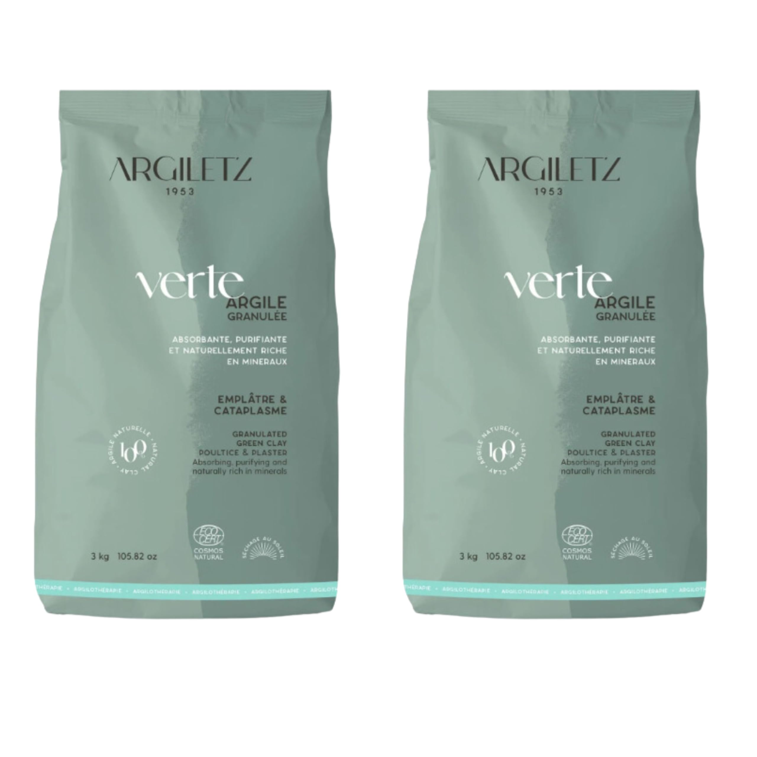 A naturally concentrated bio-mineral supplement rich in various easily absorbed minerals. 2 x 3kg of crushed green clay - French clay, sun-dried - non-ionized, non-irradiated, color- and preservative-free. QUALITY ? ISO 9001 certified product Manufactured with respect for people and nature. NATURAL ? 100 natural clay Sun-dried Subjected to numerous controls. MULTI-PURPOSE ? Facial beauty mask Hair mask Soothing treatment.