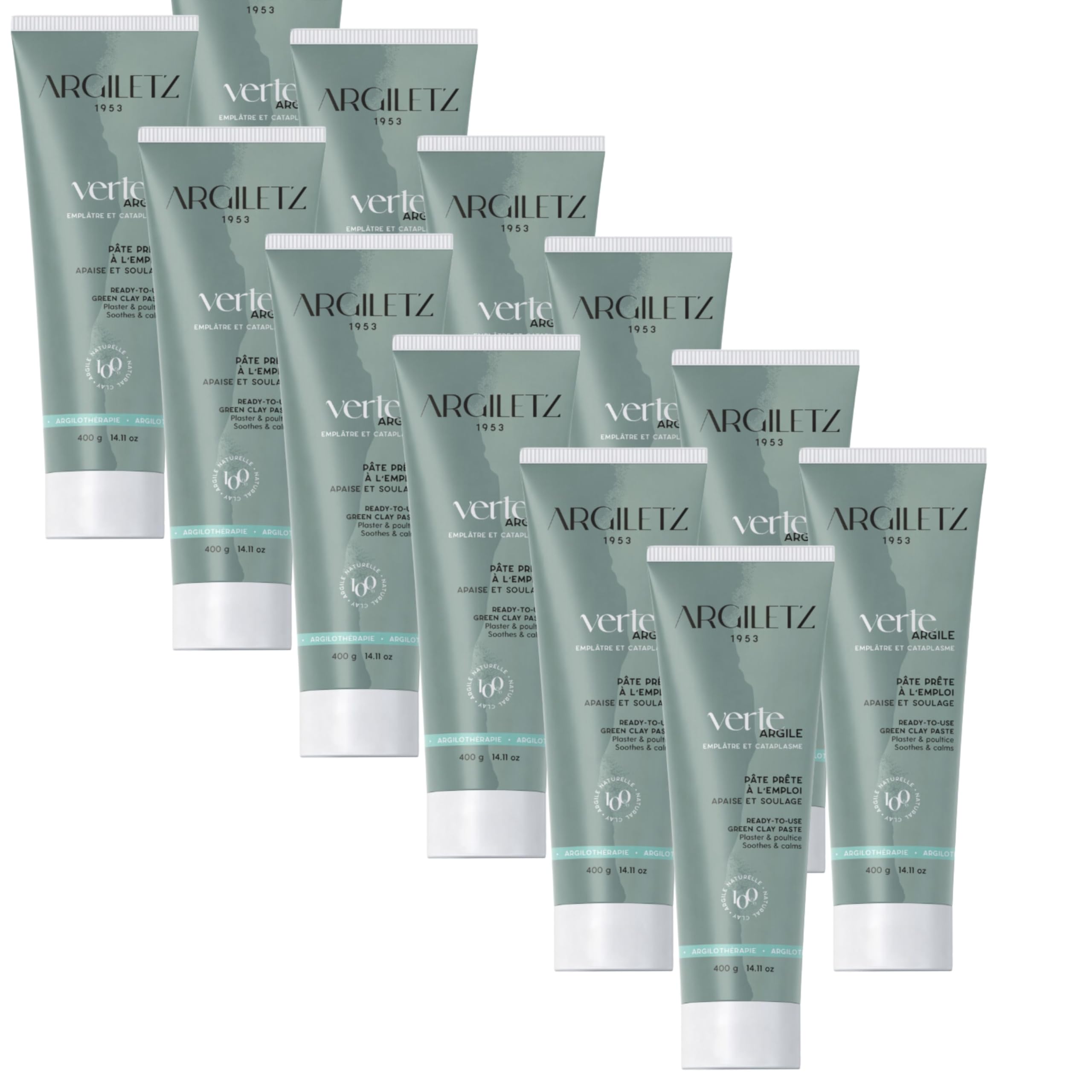 12 x 400g tubes of green clay - French clay, sun-dried - non-ionized, non-irradiated, color- and preservative-free. QUALITY ? ISO 9001 certified product Manufactured with respect for people and nature. NATURAL ? 100 natural clay Sun-dried Subjected to numerous controls. MULTI-PURPOSE ? Facial beauty mask Hair mask Soothing treatment.