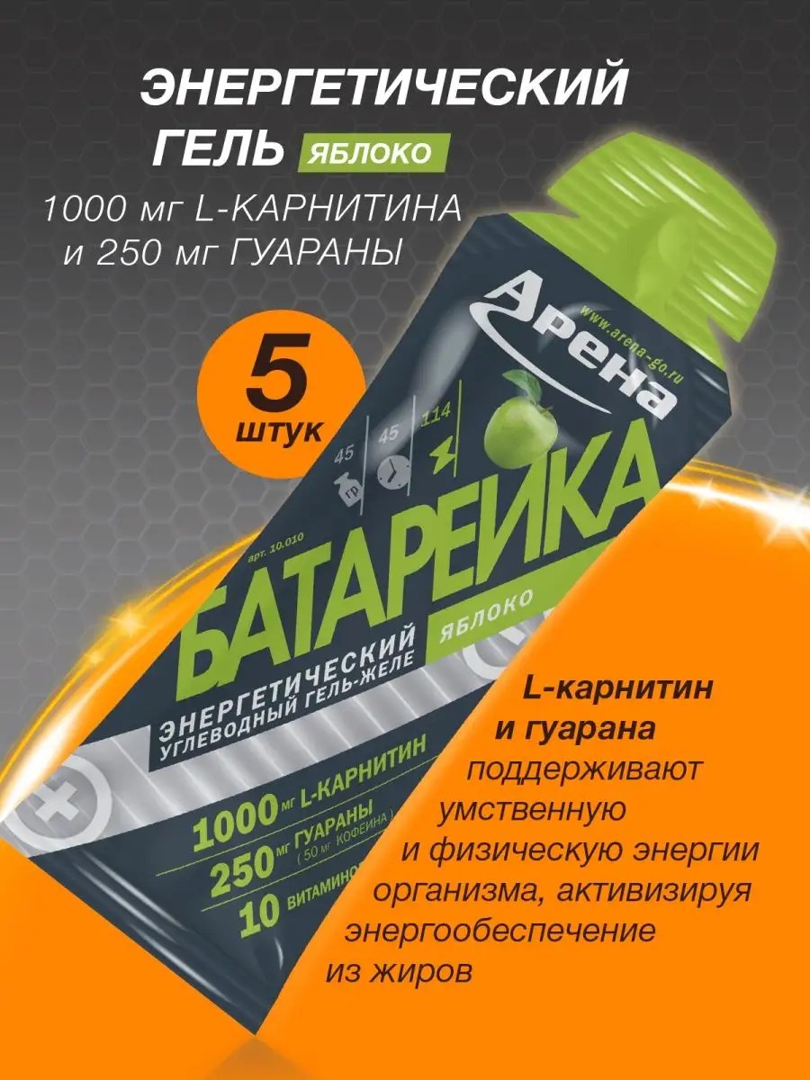 Энергетический питьевой гель Арена со вкусом яблока, содержащий 1000 мг L-карнитина и 250 мг экстракта гуараны (эквивалент 50 мг кофеина) можно использовать как жиросжигающее спортивное питание, предстартовый быстрый перекус, питание в первой части длительной тренировки или соревнования - бег, велосипед, плавание, триатлон, лыжные гонки.