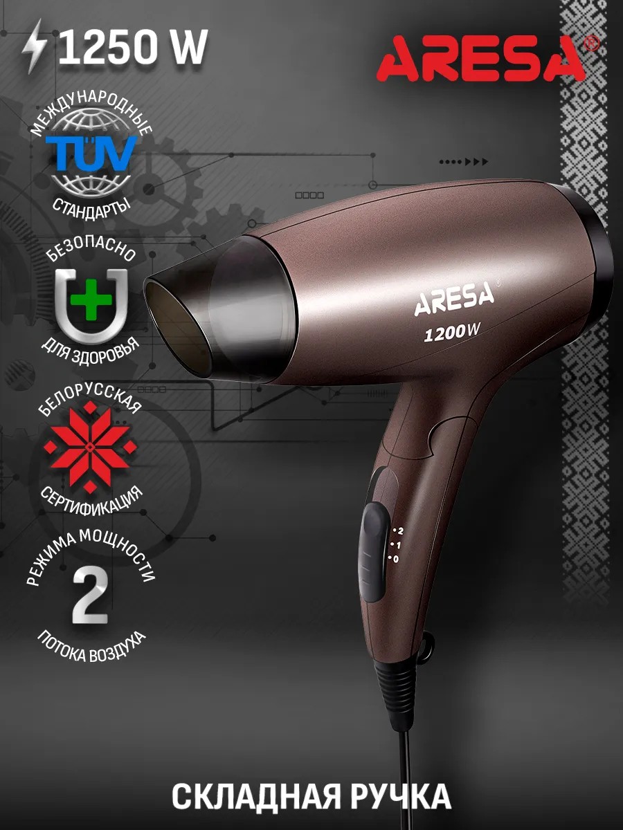 The ARESA AR-3214 hair dryer is a modern device that meets all certification standards. ARESA hair dryers have been certified by the State Standards Center of the Republic of Belarus. This ensures that all device specifications meet the stated specifications. When set correctly, the device will never damage or overdry your hair. It can also be used to dry children's hair. The AR-3214 has a power of 1250 W, allowing it to quickly dry wet hair and handle any styling. By selecting the airflow speed, you can find the perfect setting for your hair type. The AR-3214 has two speed settings. The included concentrator nozzle allows you to create any style. The hair dryer has a folding handle and compact size, making it indispensable for any trip or trip to the pool. It won't take up much space. The AR-3214 hair dryer is equipped with a hanging loop for convenient storage. Its stylish design makes it a great gift. ARESA is a Belarusian brand of household appliances. In addition to Customs Union certificates obtained in the Republic of Belarus, by purchasing our equipment, you care about the health and safety of you and your loved ones.