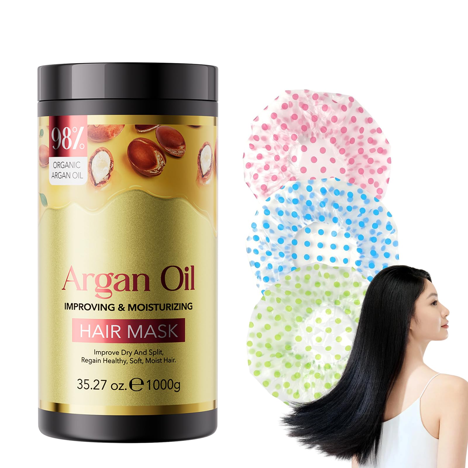 Nourishes the hair depth: The 1000 g hair mask with argan oil is enriched with the natural power of argan oil, which penetrates deep into the hair follicles and intensively supplies dry, damaged and brittle hair with moisture and nutrients. It helps restore moisture and elasticity and makes hair soft, supple and healthy. Restores shine and suppleness: this hair mask enhances your hair's natural shine and smoothes its texture. It repairs split ends, frizz and rough hair and makes your hair look shiny, silky and combable after every application. Strengthens and Protects: Rich in essential fatty acids and antioxidants, the hair mask with argan oil strengthens hair, prevents hair breakage and promotes healthy growth. In addition, it forms a protective layer on the hair, which protects it from environmental damage, heat styling and harmful substances. IMPROVES HAIR ELASTICITY: Regular use of this nourishing mask helps improve hair elasticity, making it stronger and less susceptible to damage. The mask restores vitality and gives the hair a soft, springy feeling and more flexibility. Ideal for all hair types: This deeply effective hair mask is suitable for all hair types and is gentle enough for daily use. Whether you have curly, smooth or colored hair, it helps improve texture and gives your hair the care it deserves. INGREDIENTS argan oil SAFETY WARNING Keep the container tightly closed in a dry and well-ventilated place. See moreIdeal for all hair types: This deeply effective hair mask is suitable for all hair types and is gentle enough for daily use. Whether you have curly, smooth or colored hair, it helps improve texture and gives your hair the care it deserves. IMPROVES HAIR ELASTICITY: Regular use of this nourishing mask helps improve hair elasticity, making it stronger and less susceptible to damage. The mask restores vitality and gives the hair a soft, springy feeling and more flexibility. Strengthens and Protects: Rich in essential fatty acids and antioxidants, the hair mask with argan oil strengthens hair, prevents hair breakage and promotes healthy growth. In addition, it forms a protective layer on the hair, which protects it from environmental damage, heat styling and harmful substances. Restores shine and suppleness: this hair mask enhances your hair's natural shine and smoothes its texture. It repairs split ends, frizz and rough hair and makes your hair look shiny, silky and combable after every application. Nourishes the hair depth: The 1000 g hair mask with argan oil is enriched with the natural power of argan oil, which penetrates deep into the hair follicles and intensively supplies dry, damaged and brittle hair with moisture and nutrients. It helps restore moisture and elasticity and makes hair soft, supple and healthy.Arganolie haarmasker conditioner met 3 douchemutsen, haarmasker intensieve reparatie en glans voor beschadigd haar, met biologische arganolie voor zijdeachtige zachtheid Voedt het haardiepte: het haarmasker met arganolie van 1000 g is verrijkt met de natuurlijke kracht van arganolie, die diep in de haarzakjes doordringt en droog, beschadigd en broos haar intensief met vocht en voedingsstoffen voorziet. Het helpt vocht en elasticiteit te herstellen en maakt het haar zacht, soepel en gezond. Herstelt glans en soepelheid: dit haarmasker versterkt de natuurlijke glans van je haar en maakt de textuur glad. Het herstelt gespleten haarpunten, kroezen en ruw haar en zorgt ervoor dat je haar er na elke toepassing glanzend, zijdeachtig en kambaar uitziet. Versterkt en beschermt: het haarmasker met arganolie is rijk aan essentiële vetzuren en antioxidanten, versterkt het haar, voorkomt haarbreuk en bevordert een gezonde groei. Bovendien vormt het een beschermlaag op het haar, die het beschermt tegen milieuschade, hittestyling en schadelijke stoffen. VERBETERT DE ELASTICITEIT VAN HET HAAR: Regelmatig gebruik van dit voedende masker helpt de elasticiteit van het haar te verbeteren, waardoor het sterker en minder gevoelig is voor schade. Het masker herstelt de vitaliteit en geeft het haar een zacht, verend gevoel en meer flexibiliteit. Ideaal voor alle haartypes: dit diep effectieve haarmasker is geschikt voor alle haartypes en is zacht genoeg voor dagelijks gebruik. Of je nu krullend, glad of gekleurd haar hebt, het helpt de textuur te verbeteren en geeft je haar de verzorging die het verdient. INGREDIËNTEN arganolie VEILIGHEIDSWAARSCHUWING Houd de container goed gesloten op een droge en goed geventileerde plaats. Meer bekijkenIdeaal voor alle haartypes: dit diep effectieve haarmasker is geschikt voor alle haartypes en is zacht genoeg voor dagelijks gebruik. Of je nu krullend, glad of gekleurd haar hebt, het helpt de textuur te verbeteren en geeft je haar de verzorging die het verdient. VERBETERT DE ELASTICITEIT VAN HET HAAR: Regelmatig gebruik van dit voedende masker helpt de elasticiteit van het haar te verbeteren, waardoor het sterker en minder gevoelig is voor schade. Het masker herstelt de vitaliteit en geeft het haar een zacht, verend gevoel en meer flexibiliteit. Versterkt en beschermt: het haarmasker met arganolie is rijk aan essentiële vetzuren en antioxidanten, versterkt het haar, voorkomt haarbreuk en bevordert een gezonde groei. Bovendien vormt het een beschermlaag op het haar, die het beschermt tegen milieuschade, hittestyling en schadelijke stoffen. Herstelt glans en soepelheid: dit haarmasker versterkt de natuurlijke glans van je haar en maakt de textuur glad. Het herstelt gespleten haarpunten, kroezen en ruw haar en zorgt ervoor dat je haar er na elke toepassing glanzend, zijdeachtig en kambaar uitziet. Voedt het haardiepte: het haarmasker met arganolie van 1000 g is verrijkt met de natuurlijke kracht van arganolie, die diep in de haarzakjes doordringt en droog, beschadigd en broos haar intensief met vocht en voedingsstoffen voorziet. Het helpt vocht en elasticiteit te herstellen en maakt het haar zacht, soepel en gezond.