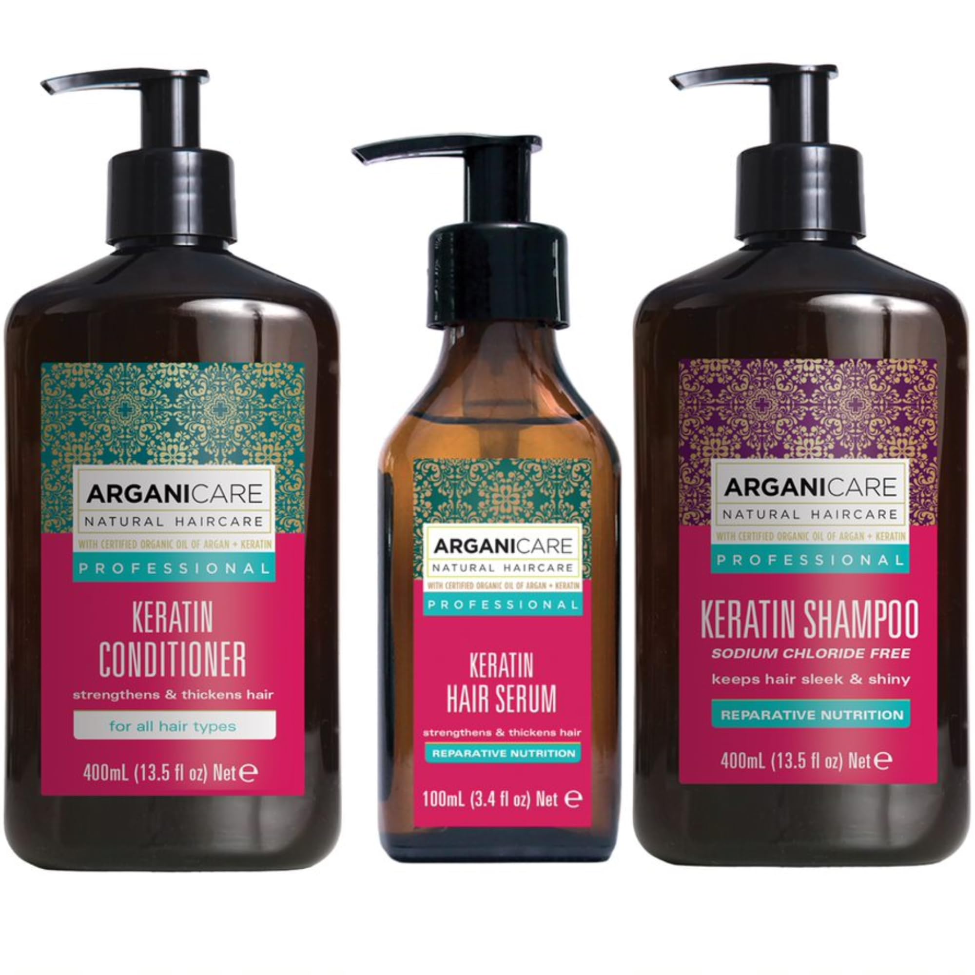 DIRECTIONS FOR USE Wet hair thoroughly, massage gently into scalp, lather, and rinse well. After shampooing, apply to wet hair, concentrating on the ends. Leave on for 2 to 3 minutes and rinse thoroughly. For daily use, apply a small amount of serum to damp hair, dry, and style.CONTENTS Keratin Range Shampoo 400ML Conditioner 400ML Serum 100ML. THE SHAMPOO: Wet hair thoroughly, massage the scalp gently, lather and rinse well. THE CONDITIONER: After shampooing, apply to wet hair, paying particular attention to the ends. Leave on for 2 to 3 minutes and rinse thoroughly. THE SERUM: For daily use, apply a small amount of serum to damp hair, dry and style. THE SERUM It strengthens and protects dry and damaged hair, while keeping it smooth and silky. This serum provides a protective coating that renews the hair's internal resistance. REPAIRING AND NUTRITIVE CONDITIONER Arganicare repairing and nourishing conditioner is designed to provide nutrients to the hair, smoothing it and protecting it by strengthening its internal structure. THE SHAMPOO It is designed to intensely regenerate damaged or chemically treated hair. This shampoo is infused with keratin, an essential protein for hair, which helps protect it thanks to its protective coating. MODE D'EMPLOI Mouiller les cheveux abondamment, masser le cuir chevelu en douceur, faire mousser et bien rincer. Après le shampoing, appliquer sur les cheveux mouillés en insistant sur les pointes. Laisser poser 2 à 3 min et rincer abondamment. Pour un usage quotidien, appliquer une petite quantité de sérum sur les cheveux humides, sécher puis coiffer.CONTENU Gamme Kératine Shampoing 400ML Après Shampoing 400ML Sérum 100ML. LE SHAMPOING : Mouiller les cheveux abondamment, masser le cuir chevelu en douceur, faire mousser et bien rincer. L'APRES SHAMPOING : Après le shampoing, appliquer sur les cheveux mouillés en insistant sur les pointes.Laisser poser 2 à 3 min et rincer abondamment. LE SÉRUM : Pour un usage quotidien, appliquer une petite quantité de sérum sur les cheveux humides, sécher puis coiffer. LE SÉRUM Il renforce et protège les cheveux secs et abimés, tout en les gardant lisses et soyeux. Ce sérum apporte un revêtement protecteur qui renouvelle la résistance interne du cheveu. APRES SHAMPOING RÉPARATEUR ET NUTRITIF L'après shampooing réparateur et nutritif Arganicare est conçu pour apporter des éléments nutritifs aux cheveux, les lisser et les protéger en renforçant leur structure interne. LE SHAMPOING Il est conçu pour régénérer intensément les cheveux abimés ou chimiquement traités. Ce shampoing infusé à la kératine, une protéine essentielle pour les cheveux, permet de les protéger grâce à son revêtement protecteur.