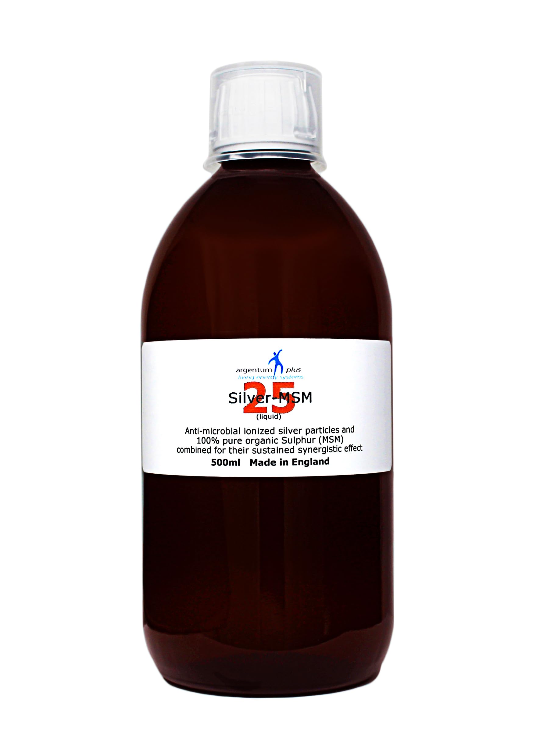 : Silver-MSM 25 Liquid is a combination of silver and 100 pure organic sulfur (MSM). The combination of silver and MSM in a single product amplifies the beneficial effects of each substance. The union of these two compounds prolongs the activity of the silver particles, thus improving their effectiveness. This product has high stability. Silver content: 100 µg (micrograms) per 5 ml dose. MSM content: 5000 mg per 5 ml dose. Product labels are in English, but a French translation will be sent to you. Ingredients: Purified Water, MSM, SilverPackaged in an amber-colored glass bottle. The combination of silver and MSM in a single product amplifies the beneficial effects of each substance. Continuous laboratory testing guarantees its safety and efficacy. A standardized product with a proven track record since 2005.Description du produit L'Argent-MSM 25 Liquide est une association d'argent avec du soufre organique pur à 100 (MSM). La combinaison d'argent et de MSM en un seul produit décuple les effets bénéfiques de chaque substance. L'union de ces deux composés a pour effet de prolonger l' activité des particules d'argent et donc d'en améliorer son efficacité. Produit à stabilité élevée. Teneur en argent : 100 µg (microgramme) par dose de 5 ml. Teneur en MSM : 5000 mg par dose de 5 ml. Les étiquettes des produits sont en anglais, mais une traduction en français vous sera envoyée. Ingrédients: Eau purifiée, MSM, Argent Ingrédients Eau purifiée, MSM, ArgentEmballé dans un flacon en verre de couleur ambrée. La combinaison d'Argent et MSM en un seul produit décuple les effets bénéfiques de chaque substance. Un contrôle continu en laboratoire garantit la sureté de son emploi et son efficacité. Produit normalisé ayant fait ses preuves depuis 2005.Argent-MSM 25 Liquide - Contenance : 500 ml