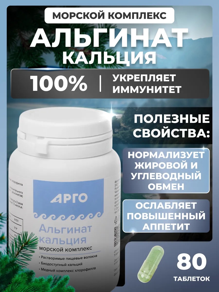Альгинат кальция в капсулах морской комплекс от АРГО - это профилактика Остеопороза, Рака толстой кишки. Альгинат кальция является источником растворимых пищевых волокон морского происхождения, это биодоступный кальций, а также это медный комплекс хлорофилла. Не содержит вспомогательных веществ. Этот продукт не только улучшает функциональное состояние пищеварительного тракта, но и защищает организм от вредных веществ, поддерживает иммунную систему и нормализует обмен кальция.