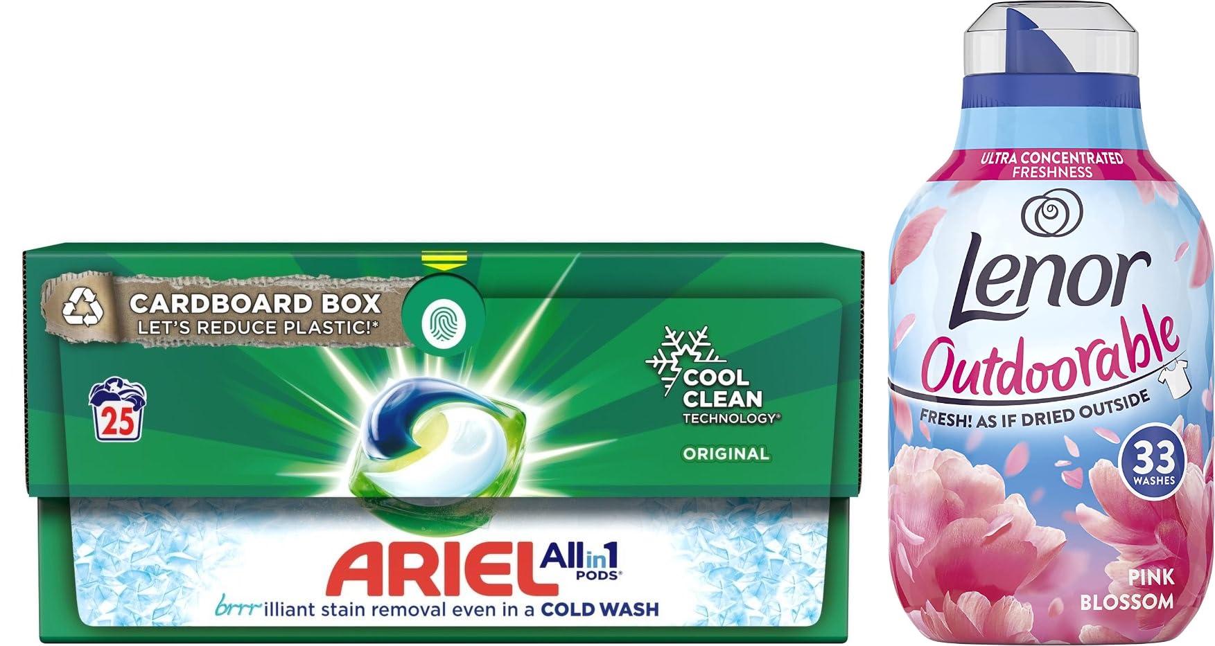 The newest innovation from Ariel brings our best pod ever to your laundry room: Ariel Original All-in-1 PODS have everything you need for clean, bright and fresh-smelling clothes in a tiny, but powerful capsule. Pod away serious sweat stains, impossible dirt and stubborn food particles and revel in the feel of exceptionally clean clothes! The super-concentrated Ariel Original All-in-1 PODS washing capsules come with a smart multi-compartment design that keeps ingredients separate until they reach the wash. Upon contact with water the film dissolves to release powerful stain-removing technologies, offering our deepest and strongest clean yet. Enjoy freshness as if you've dried your clothes outside, even when you dry inside with Lenor Outdoorable's ultra-concentrated formula. Thanks to its innovative technology, you just need a small dose to get that line dried feeling, whatever the weather! Bottle made of 100 recycled (excluding cap, spout and sleeve) and recyclable (excl. sleeve) plastic. Lenor Outdoorable was developed together with consumers to recreate the outdoor freshness and it keeps releg freshness when fabrics are just dried, stored in the cupboard and even when you're moving. INGREDIENTS 1-(1,2,3,4,5,6,7,8-Octahydro-2,3,8,8-tetramethyl-2-naphthyl)-ethan-1-one (OTNE). • 5-15 Cationic Surfactants, Perfumes, Benzyl Salicylate, Citronellol, Geraniol, Hexyl Cinnamal, Limonene, Linalool DIRECTIONS READ BEFORE USE THE LABELS, WARNING AND INSTRUCTION PROVIDED WITH THE PRODUCT AND RETAIN THESE IMPORTANT SAFETY INSTRUCTIONS FOR FUTURE REFERENCE. SAFETY WARNING Keep away for reach children. Causes serious eye damage. Causes skin irritation. Contains 1-(1,2,3,4,5,6,7,8-Octahydro-2,3,8,8-tetramethyl-2-naphthyl)-ethan-1-one (OTNE). May produce an allergic reaction. Contains benzyl salicylate. May produce an allergic reaction. Contains sensitizing substances. May produce an allergic reaction. Always read the label and product information before use. Harmful to aquatic life with long lasting effects.• Liquid fabric softener can increase fabric flammability. Using more than recommended can increase this effect. Do not use this product: - On children's sleepwear or garments labelled as flame resistant as it may reduce flame resistance. - On garments made with fluffier fabrics (such as fleece, velour, chenille, and terry cloth). Contains Delta-Damascone, Linalool, Hexyl cinnamal, Tetramethyl Acetyloctahydronaphthalenes, (E Z)-ethyl 2-acetyl-4-methyltridec-2-enoate. May produce an allergic reaction. See moreLenor Outdoorable Pink Blossom has a new and rosy scent characterized by apple blossom brightness, sweet melon and warm amber. Enjoy freshness as if you've dried your clothes outside, even when you dry inside with Lenor Outdoorable's ultra-concentrated formula. The unique multi-compartment design holds a super concentrated cleaning formula, while the innovative film dissolves completely when it comes in contact with water. Ariel All-in-1 PODS Washing Liquid Laundry Detergent Capsules Original provide brilliant stain removal even in a cold wash. They have been designed for cold, with unique technologies like COOL CLEAN Technology. Bundle Pack PACKING MAY VARY.
