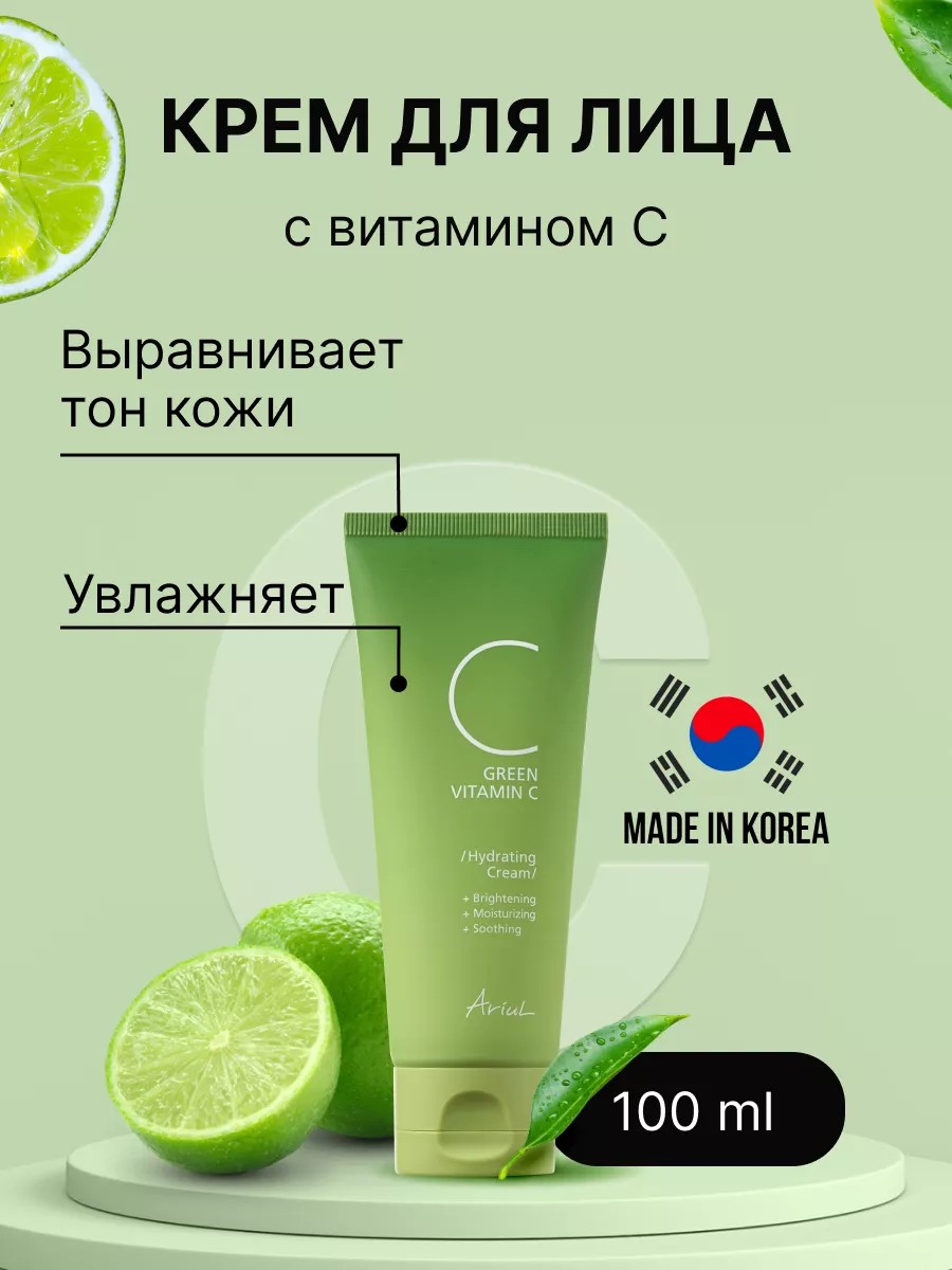 Ощутите на себе силу природы с нашим кремом Ariul Green Vitamin C Hydrating Cream! Увлажняющий крем для лица, обогащенный витамином С, помогает бороться с признаками старения, выравнивать тон кожи и придавать ей здоровое сияние.