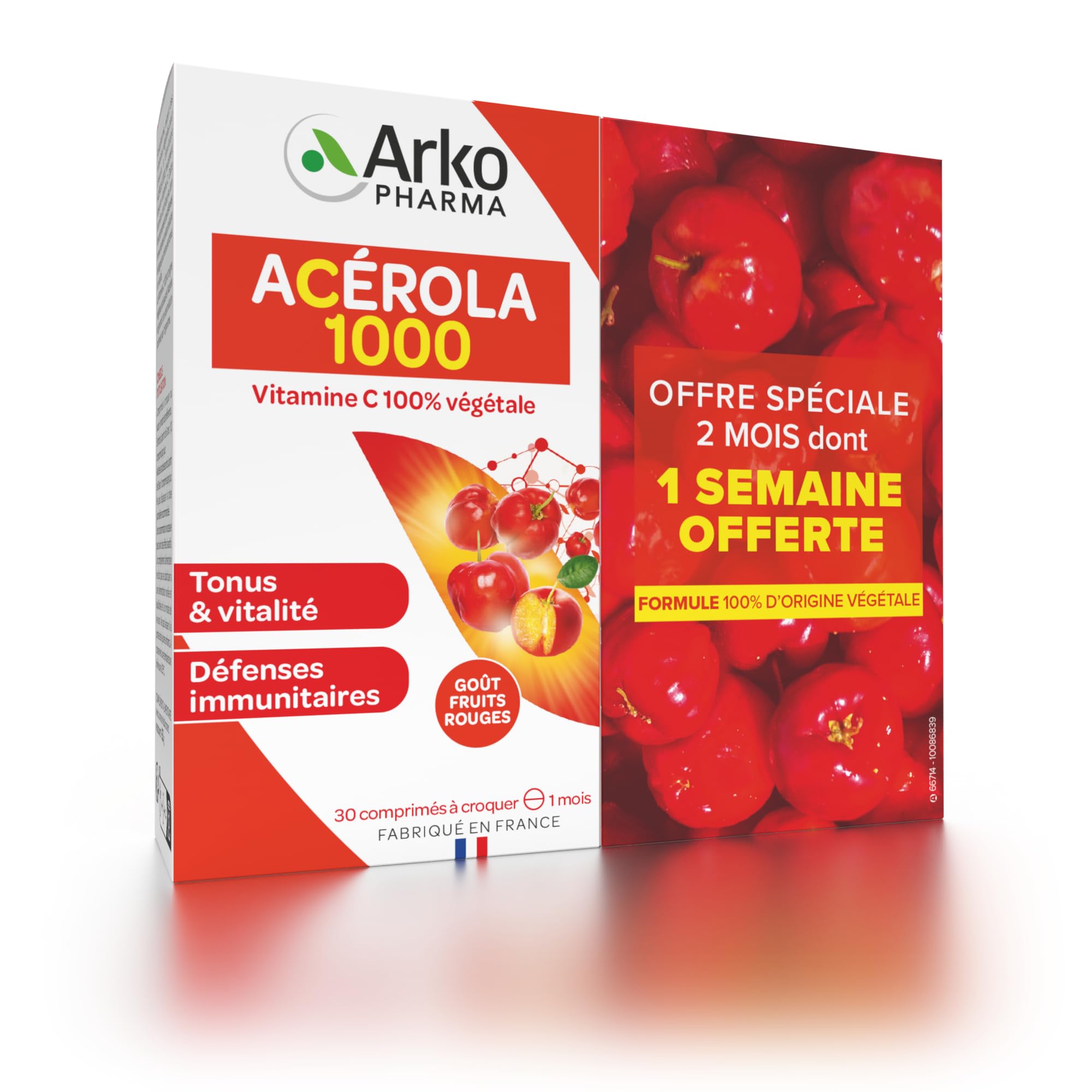 : Discover Azinc Acerola 1000: a natural food supplement rich in vitamin C, available as a 2-month course. Each tablet contains 170mg of vitamin C, representing 213 of the reference intake. With 100 plant-based ingredients, Arkovital Acerola 1000 supports the immune system, helps reduce fatigue, and restores energy during demanding periods. Arkopharma's certified laboratories have specialized in natural solutions for over 40 years, offering profound and lasting well-being. Ingredients: Acerola berry juice powder (Malpighia glabra L.) – Bulking agent: sorbitol – Xylitol – Fructose – Sucrose – Color: beetroot red – Natural flavoring – Anti-caking agent: magnesium stearate – Sweetener: steviol glycosides from stevia. P.when('A').execute(function(A) { A.on('a:expander:toggle_description:toggle:collapse', function(data) { window.scroll(0, data.expander. expander[0].offsetTop-100) }) }) Instructions for Use Dosage Chewable or suckable tablets, preferably in the morning. Children from 6 years: 1 2 tablet per day. Adults and adolescents from 15 years: 1 tablet per day. Safety Warning Do not exceed the recommended daily dose. A food supplement should not replace a varied and balanced diet and a healthy lifestyle. Keep out of reach of young children. Store away from light, heat, and moisture. AZINC Acerola 1000 tablets contain polyols. Excessive consumption may have laxative effects. See moreCERTIFIED LABORATORY: Arkopharma's certified laboratories have specialized in natural solutions for over 40 years, offering deep and lasting well-being. 2-MONTH COURSE: This pack of two boxes of 30 chewable tablets provides a 2-month course, with one tablet per day. Suitable for adults, teenagers, and children from 6 years old. 100 PLANT-BASED INGREDIENTS: These chewable tablets are 100 plant-based, with no chemical ingredients or artificial colors. Each tablet provides 170mg of vitamin C. IMMUNITY: The vitamin C in Azinc is extracted from the acerola fruit and is 100 natural, to strengthen the immune system. FATIGUE AND ENERGY: Acerola is a food supplement rich in vitamin C, to combat general fatigue, chronic fatigue or temporary fatigue.Description du produit Découvrez Azinc Acérola 1000 : un complément alimentaire naturel et riche en vitamine C, proposé en cure de 2 mois. Chaque comprimé contient 170mg de vitamine C, ce qui représente 213 des valeurs nutritionnelles de référence. Avec des ingrédients 100 d'origine végétale, Arkovital Acérola 1000 soutient les défenses immunitaires, aide à réduire la fatigue et redonne de l'énergie en périodes exigeantes. Les laboratoires certifiés Arkopharma se spécialisent dans les solutions naturelles depuis plus de 40 ans, pour offrir un bien-être profond et durable. Ingrédients Poudre de jus de baie d'acérola (Malpighia glabra L.) – Agent de charge: sorbitol – Xylitol – Fructose – Saccharose – Colorant : rouge de betterave – Arôme naturel – Antiagglomérant: stéarate de magnésium – Edulcorant: glycosides de stéviol issus de stévia. P.when('A').execute(function(A) { A.on('a:expander:toggle_description:toggle:collapse', function(data) { window.scroll(0, data.expander. expander[0].offsetTop-100) }) }) Mode d'emploi Posologie Comprimés à croquer ou sucer, le matin de préférence. Enfants à partir de 6 ans : 1 2 comprimé par jour. Adultes et adolescents à partir de 15 ans : 1 comprimé par jour. Avertissement De Sûreté Ne pas dépasser la dose journalière recommandée. Un complément alimentaire ne doit pas se substituer à une alimentation variée et équilibrée et à un mode de vie sain. Ne pas laisser à la portée des jeunes enfants. Conserver à l'abri de la lumière, de la chaleur et de l'humidité. Les comprimés AZINC Acérola 1000 contiennent des polyols. Une consommation excessive peut avoir des effets laxatifs. Voir plusLABORATOIRE CERTIFIÉ : Les laboratoires certifiés Arkopharma se spécialisent dans les solutions naturelles depuis plus de 40 ans, pour offrir un bien-être profond et durable. CURE DE 2 MOIS : Ce lot de 2 boîtes de 30 comprimés à croquer permet de faire une cure de 2 mois, à raison d'un comprimé par jour. Convient aux adultes, adolescents et aux enfants à partir de 6 ans. INGRÉDIENTS À 100 D'ORIGINE VÉGÉTALE : Ces comprimés à croquer sont à 100 d'origine végétale, sans ingrédients chimiques et sans colorants chimiques. Chaque comprimé apporte 170mg de vitamine C. IMMUNITÉ : La vitamine C contenue dans Azinc est extraite du fruit de l'acérola et à 100 d'origine naturelle, pour renforcer les défenses immunitaires. FATIGUE ET ÉNERGIE : Acérola est un complément alimentaire riche en vitamine C, pour lutter contre un état de fatigue générale, une fatigue chronique ou une fatigue passagère.Arkopharma - lot de 2 boites Arkovital Acerola 1000 - gout fruits rouges - 60 Comprimés à Croquer