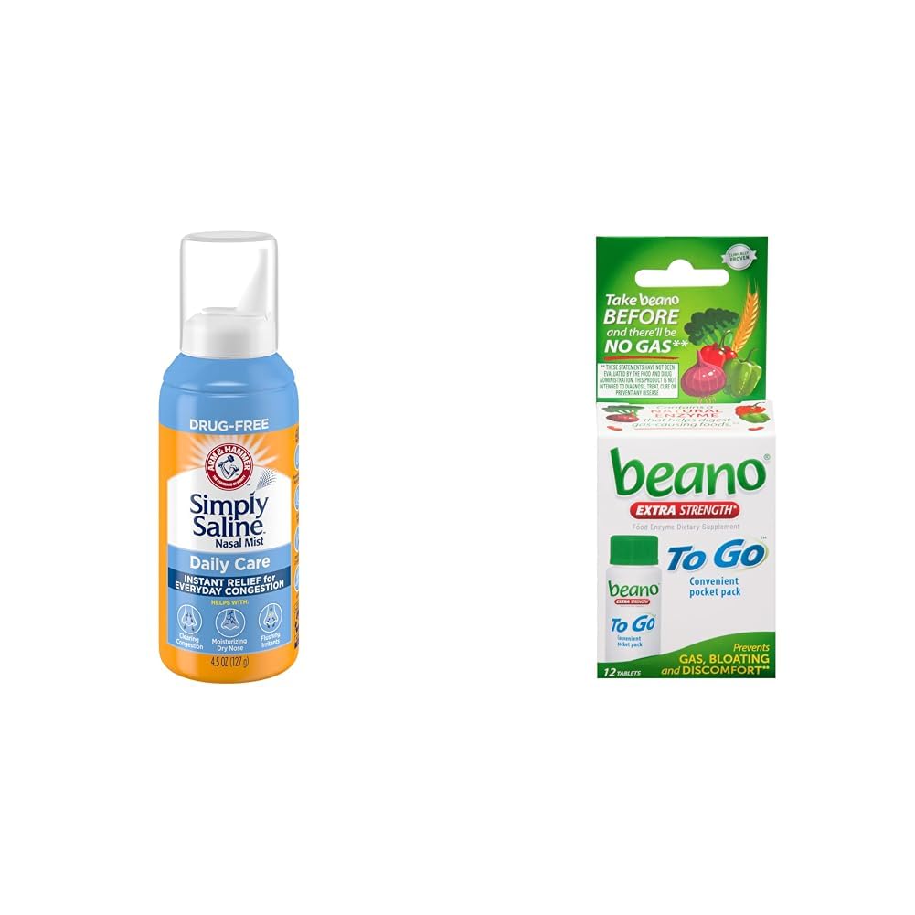 This bundle pairs Simply Saline nasal spray with Beano gas relief tablets to provide solutions for nasal and digestive issues. The Simply Saline nasal spray delivers instant congestion relief by moisturizing dry nasal passages and flushing out irritants with its isotonic formula containing only purified water, salt and ARM HAMMER Baking Soda. Its adaptable nozzle provides a gentle mist to clear stuffy noses. Meanwhile, the Beano To Go gas prevention tablets use a natural enzyme to break down complex carbohydrates in beans, vegetables, whole grains and other gas-causing foods to prevent bloating and stomach discomfort. The convenient 12-tablet travel pack makes Beano easy to take when dining out. Together, these complementary products promote sinus and digestive health, allowing you to comfortably enjoy a healthy, vegetable-rich diet. The nasal spray relieves congestion and nasal irritation while Beano enables digestion of nutritious high-fiber foods. This bundle provides targeted solutions for common nasal and digestive issues.