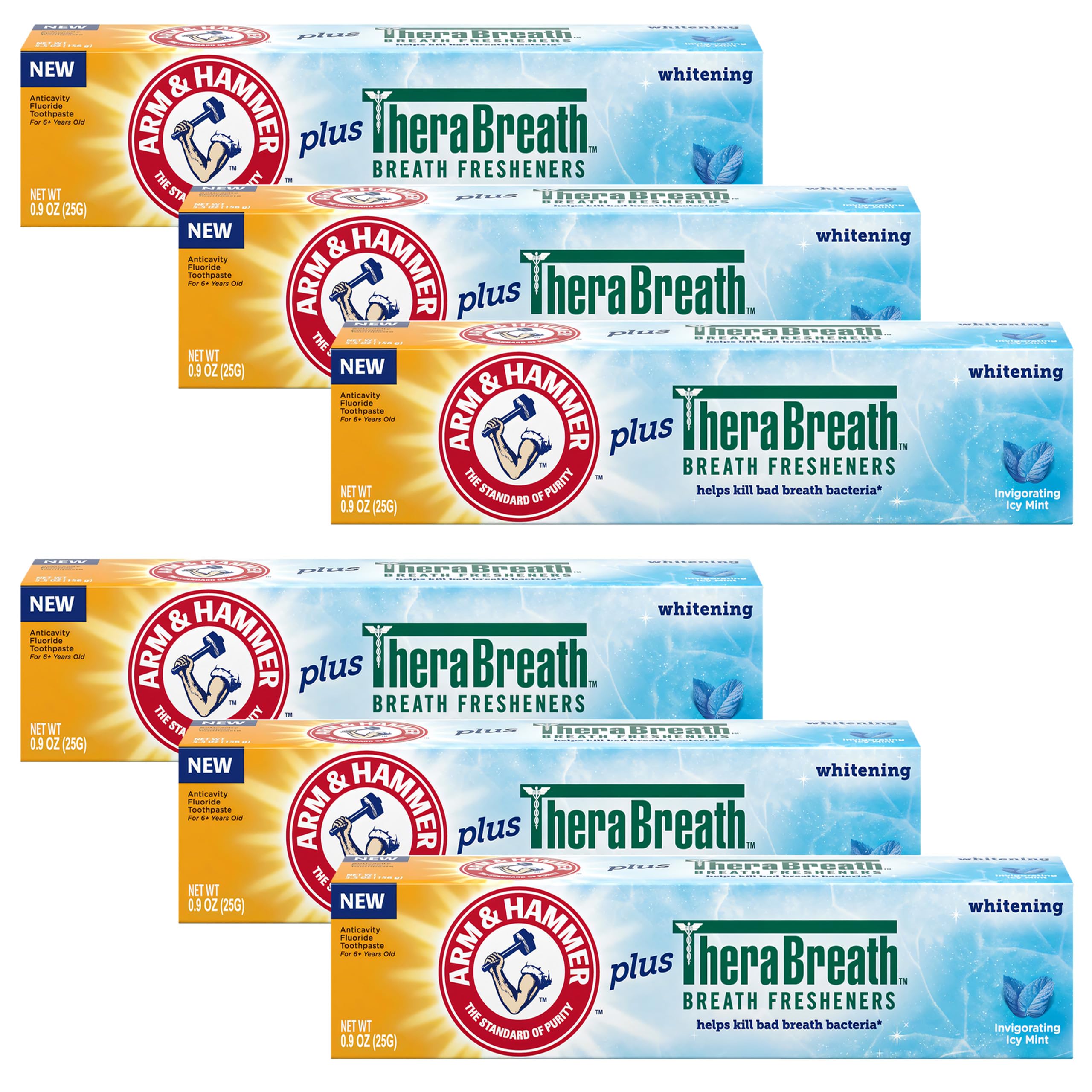 ARM HAMMER WHITENING TOOTHPASTE With the Arm Hammer Whitening Toothpaste 6-Pack, you're always ready to maintain a healthy, radiant smile. Whether at home, on vacation, or at the office, this convenient pack of six (6) 0.9oz tubes is perfect for keeping your oral care routine on point—without breaking the bank. Gentle Whitening That Actually Works Say goodbye to harsh whitening formulas! This toothpaste uses real baking soda to gently lift stains and brighten your teeth while protecting your enamel. Achieve a naturally whiter smile without worrying about sensitivity. Deep Clean for Healthier Teeth and Gums It's not just about looks—this toothpaste dives deep to remove up to three times more plaque than ordinary toothpastes. Plus, it actively fights cavities and supports gum health for a smile that feels as good as it looks. Icy Mint Freshness That Lasts Bad breath? Not anymore. With Fresheners, this toothpaste eliminates odor-causing bacteria, leaving your breath fresh and minty for hours. No masking—just long-lasting confidence. Less Abrasive, More Effective Designed to be gentle on sensitive teeth, this formula strikes the perfect balance: tough on plaque and stains, yet kind to enamel. Get a powerful clean without the worry. All-in-One Oral Care Solution From whitening to plaque removal, fresh breath to cavity protection, this toothpaste has it all. Make it your go-to for a healthier, brighter smile every day.HEALTHIER TEETH AND GUMS: This toothpaste fights cavities, reduces plaque, and supports gum health, making it an all-in-one solution for fresh breath, whiter teeth, and healthier smiles every day. LESS ABRASIVE, MORE EFFECTIVE: Unlike many whitening toothpastes, this formula is gentle on enamel but tough on plaque, removing up to three times more without harming sensitive teeth. LONG-LASTING FRESH BREATH: With Thera Fresheners, this toothpaste doesn't just mask bad breath it fights the bacteria that cause it, giving you an icy mint freshness that lasts. GENTLE WHITENING DEEP CLEAN: Arm Hammer Whitening Toothpaste uses real baking soda to deeply clean your teeth and gums while gently whitening, so you can enjoy a brighter smile without the harshness of many other toothpastes. CONVENIENT 6-PACK: Stock up with six (6) 0.9oz tubes in one pack, so you're always ready to maintain your smile, whether at home or on the go—at a great value.