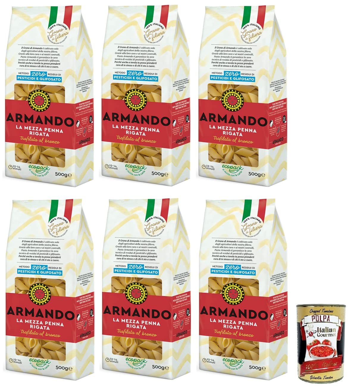 Armando La Mezza Penna Rigata bronze drawn pasta 100 Italian pasta 500 g + Italian gourmet Polpa di Pomodoro 400 g can