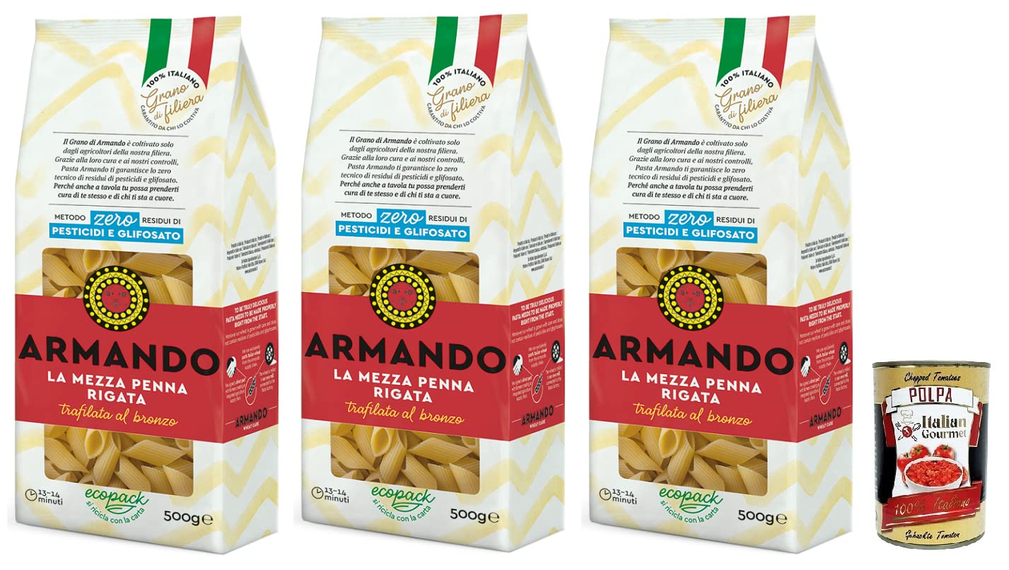 Armando La Mezza Penna Rigata, bronzen getrokken pasta, 100 Italiaanse pasta 500 g Italiaanse gourmet Polpa di Pomodoro 400 g blik