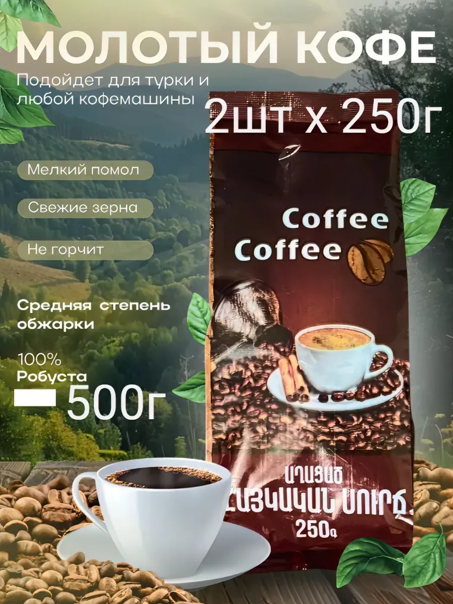 Любителям насыщенного аромата и приятного вкуса предлагаем наш производительный армянский кофе "Coffee-Coffee". Хотите знать аромат и вкус Армении? Скучаете по Армении? Хотите начинать день хорошо, с яркой ноты, но не знайте как? Мы поможем нашим армянским кофе- изготовленным новейшими технологиями и их натуральных зёрен Классическое сочетание свежо обжаренных зёрен для получения крепкого кофе который даст вам незабываемые эмоции на протяжение всего дня. Состав:робуста, средняя обжарка, свежий зерна с бодрым ароматом. Отлично подходит для тех кто любит эспрессо, американо, латте с густой пенкой, капучино и особенно понравиться тем кто соблюдает правильное питание и занимается спортом(наш кофе в зернах даёт много энергии). Правильная обжарка зерен дает уникальный вкус и аромат. Рекомендуется пить с вкусняшками для получения более ярких эмоции. Наш армянский кофе робуста специально упакован в таких флоу-пакетах которые сохраняют аромат и вкус кофе максимально долго. Кофе молотый робуста "Coffee-Coffee" – это не только наслаждение в каждой чашке, но и отличный подарок. Можно использовать как подарок для коллеги, друга, жены или подруги, ещё можно дарить на ДЕНЬ РОЖДЕНИЯ, НОВЫЙ ГОД или ЮБИЛЕЙ. Каждая упаковка имеет в себе 500 граммов нашего кофе. Мы предлагаем вам наш армянский кофе, который отправим вам прямо из Армении. Желаем хорошего и насыщенного дня с нашим кофе "Coffee-Coffee".