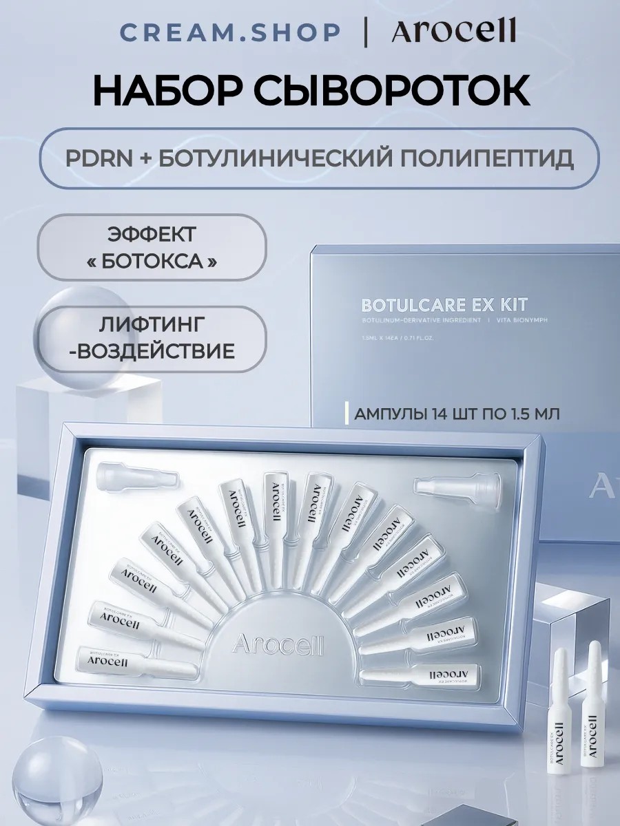 Представляем вам набор косметики для лица Arocell Botulcare Ex Kit, который станет настоящим открытием для многих женщин! Набор состоит из 14 сывороток для лица в ампулах. Концентрированная сыворотка обладает выраженным ботокс эффектом и заменяет инъекций. Состав сыворотки обогащён пептидами, олиго-гиалуроновой кислотой, экстрактом сои и лосося и другими антивозрастными компонентами. Созданный специально для женщин 45+ и 60+, этот набор обеспечивает мощный лифтинг-эффект и помогает бороться с морщинами. Он идеально подходит для сухой и возрастной кожи, обеспечивая омолаживающий уход как днем, так и ночью. Почувствуйте всю магию корейской косметики и дарите своей коже молодость и красоту! Этот набор станет прекрасным подарком для вашей мамы или любой другой особенной женщины, которая заботится о своей коже. Не упустите возможность порадовать себя или своих близких на Новый год. Уходовый набор подходит на зиму, когда коже нужно больше восстановления. Позвольте вашей коже ощутить всю эффективность ботокс-эффекта без уколов и наслаждайтесь результатом - кожа станет более упругой, гладкой и сияющей!