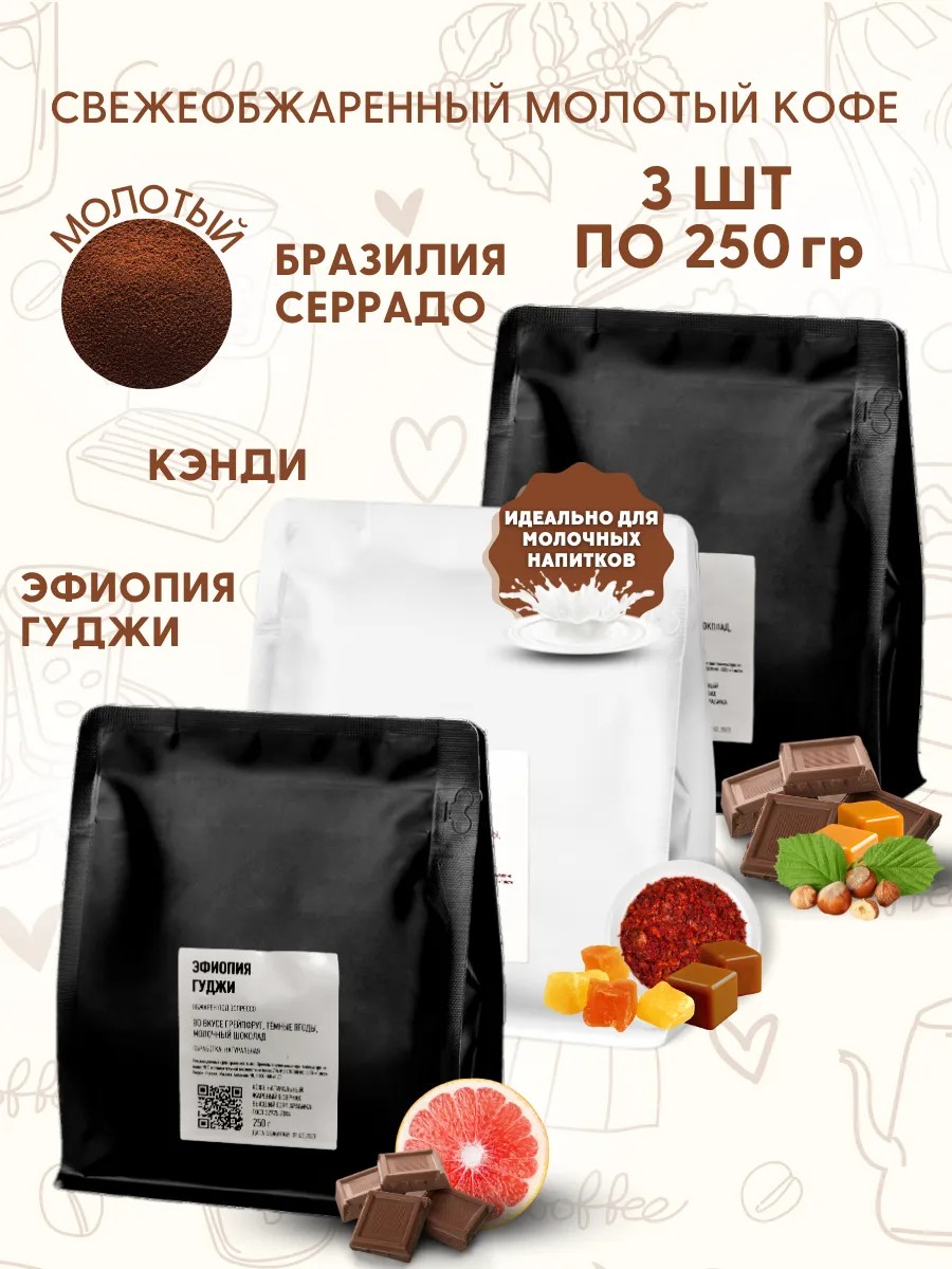 Натуральный свежеобжаренный молотый кофе Бразилия Серрадо, Кэнди, Эфиопия Гуджи. 100% арабика. Помол средний. Бразилия Серрадо, Эфиопия Гуджи - средняя обжарка. Кэнди – темная обжарка. БРАЗИЛИЯ СЕРРАДО - плотный кофе с нотами шоколада, жареных орехов и карамели. Сбалансированный вкус без лишней кислотности. Серрадо — один из трех основных кофепроизводящих регионов Бразилии наряду с Суль-де-Минас и Можиана. Бережная сборка, тщательный отбор, обработка и обжарка зерен делает этот кофе уникальным.КЭНДИ – кофе с нотами горького шоколада, специй и жженого сахара. Смесь тёмной обжарки из 100% арабики из Бразилии и Колумбии в равных пропорциях. Профиль обжарки подобран так, чтобы эспрессо, приготовленный из этого кофе, составлял идеальную основу для капучино, латте и других молочных кофейных напитков. В результате получается плотный и сладкий кофе практически без кислотности.ЭФИОПИЯ ГУДЖИ - сладкий кофе с нотами грейпфрута, тёмных ягод и молочного шоколада. Этот кофе обладает яркими дескрипторами, характерными для Эфиопии, сладостью и сбалансированной, не слишком высокой кислотностью. Идеально сочетается с молоком, а в капучино даёт вкус ягодного йогурта с шоколадными нотами. По эфиопской экспортной классификации этот кофе относится к 3 грейду — самому высокому грейду для коммерческого кофе натуральной обработки в Эфиопии. Он обладает высокими стандартами и более стабильным качеством, чем кофе 4-го грейда. Выше него — только микролоты 1 грейда, которые обычно перебирают вручную и не производят в больших объёмах. На производстве мы дополнительно очищаем этот кофе от квакеров с помощью скоростных оптических колорсортеров, что еще больше приближает его качество к 1 грейду. Этот кофе обжарен под эспрессо, также отлично подходит для капучино, латте, других кофейных напитков. Рекомендуется для приготовления в профессиональных и автоматических кофемашинах. В молотом виде отлично раскрывается в рожковых кофеварках, автоматических кофемашинах, турке, гейзерной кофеварке, френч-прессе. Кофе в зернах от легендарного производителя – это 100% оригинал. На каждой пачке есть индивидуальный QR-код, по которому можно проверить оригинальность продукта. Tasty означает "вкусный", когда речь идет о кофе! Продукт для ценителей Specialty coffee. Приготовьте кофе по своим любимым рецептам! Начните утро с чашечки хорошего ароматного кофе! Этот кофе - отличный подарок на праздники и юбилеи. Всегда оптимальная обжарка! Упаковка с клапаном дегазации сохраняет вкус и аромат кофе, а зип-лок позволяет удобно хранить и использовать продукт. Кофе произведено ООО “Тэйсти Кофе” по заказу ИП Баринов Д.А., что гарантирует качество и свежесть продукта. Отличный выбор для гурманов, любителей кофе и тех, кто хочет начать свое утро с чашки ароматного напитка. Этот кофе станет отличным подарком для гурманов и любителей кофе. Начните свое утро с чашечкой ароматного кофе из Южной Америки и Африки и наслаждайтесь его неповторимым вкусом и ароматом!