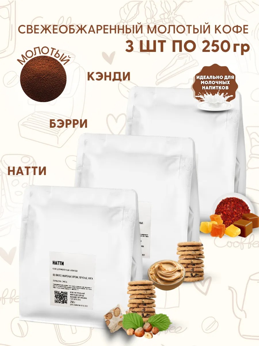 Набор 3шт по 250гр. Натуральный свежеобжаренный молотый кофе КЭНДИ, БЭРРИ, НАТТИ. 100% арабика, темная обжарка. Профиль обжарки подобран так, чтобы эспрессо, приготовленный из этого кофе, составлял идеальную основу для капучино, латте и других молочных кофейных напитков. В результате получается плотный и сладкий кофе практически без кислотности. КЭНДИ – кофе с нотами горького шоколада, специй и жженого сахара. Смесь тёмной обжарки из арабики из Бразилии и Колумбии в равных пропорциях. БЭРРИ - кофе с нотами ореховой пасты, темных ягод и печенья. Смесь тёмной обжарки из арабики из Бразилии и Эфиопии в равных пропорциях. НАТТИ - кофе с нотами жареных орехов, печенья и нуги. Эспрессо-смесь темной обжарки из двух регионов Бразилии — Суль-де-Минас и Можиана. Этот кофе обжарен под эспрессо, также отлично подходит для капучино, латте, других кофейных напитков. Рекомендуется для приготовления в профессиональных и автоматических кофемашинах. В молотом виде отлично раскрывается в рожковых кофеварках, автоматических кофемашинах, турке, гейзерной кофеварке, френч-прессе. Кофе в зернах от легендарного производителя – это 100% оригинал. На каждой пачке есть индивидуальный QR-код, по которому можно проверить оригинальность продукта. Tasty означает "вкусный", когда речь идет о кофе! Продукт для ценителей Specialty coffee. Приготовьте кофе по своим любимым рецептам! Начните утро с чашечки хорошего ароматного кофе! Этот кофе - отличный подарок на праздники и юбилеи. Всегда оптимальная обжарка! Упаковка с клапаном дегазации сохраняет вкус и аромат кофе, а зип-лок позволяет удобно хранить и использовать продукт. Кофе произведено ООО “Тэйсти Кофе” по заказу ИП Баринов Д.А., что гарантирует качество и свежесть продукта. Отличный выбор для гурманов, любителей кофе и тех, кто хочет начать свое утро с чашки ароматного напитка. Этот кофе станет отличным подарком для гурманов и любителей кофе. Начните свое утро с чашечкой ароматного кофе из Южной Америки и Африки и наслаждайтесь его неповторимым вкусом и ароматом!