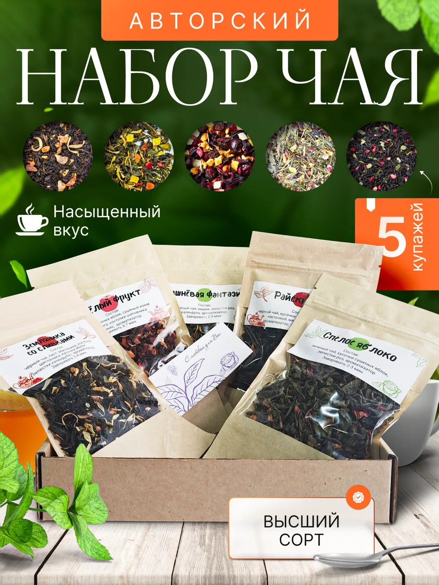 Разнообразие вкусов и широкий ассортимент чая - от классического черного и зеленого чая до экзотических фруктовых и травяных смесей. Это дает возможность выбрать напиток по своему вкусу и настроению. Качество чая определяется не только его видами и ароматами, но и основными ингредиентами. Наш набор содержит только отборные листья чая, сделанные с любовью и заботой.