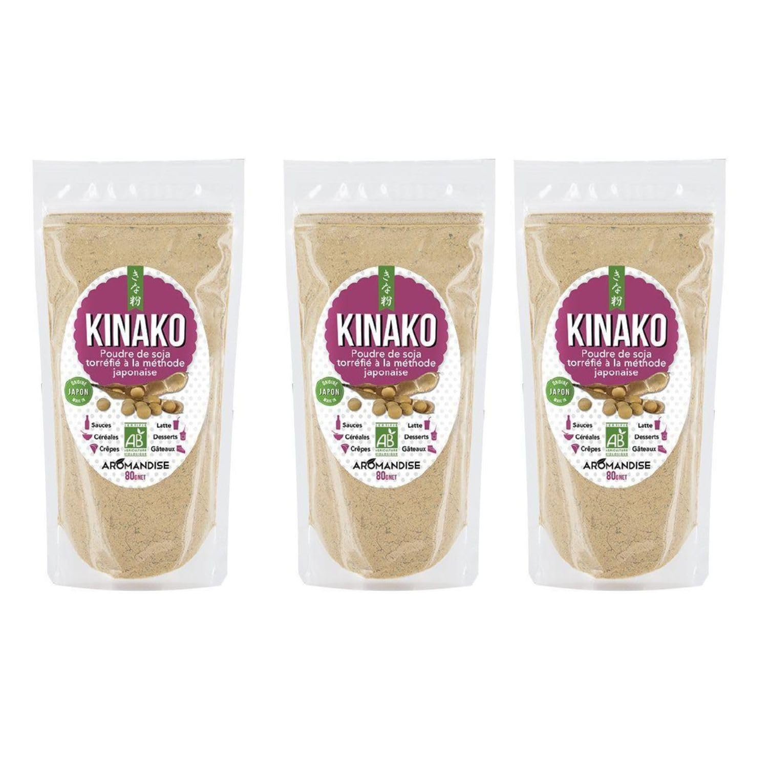 Organic Kinako Soy Powder, 3 x 200g sachets. Kinako is a traditional Japanese condiment made exclusively from roasted soybeans! Used to give a delicious peanut-hazelnut flavor to rice mochi cakes, it offers a wide range of uses for all kinds of dishes and desserts. Very easy to use, it can be sprinkled and incorporated effortlessly into your recipes. Ideal as a sugar substitute, it will become a staple in your kitchen! INGREDIENTS Organically grown roasted soybean powder