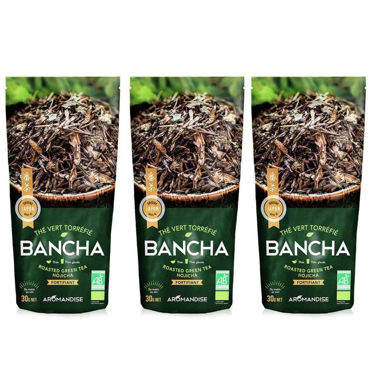 Roasted Bancha Hojicha green tea supports the immune system and enhances physical and mental performance. Roasting gives Bancha Hojicha a brown hue and a very pleasant woody aroma. It is excellent with meals, especially with fish. This very thirst-quenching tea, low in caffeine, is ideal for the evening. Liquor: Mouthfeel: smooth, almost watery. Flavors: sweet. Aromas: marine initial taste, but also very fruity (blackberry jam), smoky (toast), and woody (dry wood). Aromatic profile and finish: aromatic, with clean notes. Smooth on the palate, thanks to its very smooth, almost watery texture and sweet flavor. To prepare this iced tea: Infuse 8 g of tea per liter of cold water for 1 hour. Remove the leaves and chill. Food pairing: Bancha Hojicha pairs perfectly with smoked salmon as an appetizer. For cheese lovers, this tea pairs perfectly with soft cheeses such as Pont-l'Évêque, Brie, or Camembert. Japanese tea is exclusively green tea. Unlike other green teas, Japanese green tea undergoes a special roasting process using steam. The main Japanese teas are Sencha, Bancha, Tamaryokucha, and Gyokuro. Some Japanese teas are prepared with a level of care that only the Japanese are capable of. 3 x 30g bags.Thé vert bio japonais Bancha Hojicha 90 gDESCRIPTION DU PRODUIT Le thé vert torréfié Bancha Hojicha soutient le système immunitaire et renforce les capacités physiques et mentales. En grillant, le Bancha Hojicha prend une teinte brune et un arôme boisé très agréable. Il est excellent pendant les repas, particulièrement avec du poisson. Thé très désaltérant et léger en théine, il est idéal le soir. Liqueur : Texture en bouche : lisse, presque aqueux. Saveurs : sucrée. Arômes : attaque marine, mais aussi très fruitée (confiture de mûre), pyrogénée (pain grillé), boisée (bois sec). Profil aromatique et longueur en bouche : aromatique, avec des notes franches. Doux en bouche, grâce à une texture très lisse, presque aqueuse, et à la saveur sucrée. Préparer ce thé glacé : Infuser 8 g de thé par litre d'eau froide pendant 1 heure. Retirer les feuilles et placer au frais. Accord 'Thé et Mets' : Le Bancha Hojicha s'accorde parfaitement en entrée avec du saumon fumé. Pour les amateurs de fromage, ce thé se marie idéalement avec des fromages à pâte molle comme un Pont Levêque, un Brie, ou un Camembert. Le thé japonais est exclusivement du thé vert. Contrairement aux autres thés verts, le thé vert japonais subit une torréfaction spéciale, avec de la vapeur d'eau. Les principaux thés japonais sont les Sencha, Bancha, Tamaryokucha et Gyokuro. Certains thés du Japon sont préparés avec un luxe de soins dont seuls les japonais sont capables. 3 sachets de 30 g.