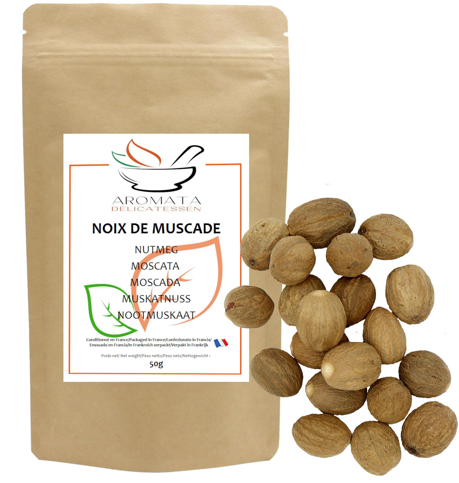 Nutmeg in a resealable kraft paper bag. Net weight 50g. Approximately 11 to 12 medium-sized nuts. Natural and additive-free. Nutmeg is an essential spice in French cuisine. An aromatic spice with warm, sweet notes, nutmeg is used to enhance many sweet dishes (crème brûlée, compotes, hot milk) and savory dishes (béchamel sauce, potato gratins, white meats). Its intense, woody flavor makes it a staple in Asian and Middle Eastern cuisine. Directions for use: Ready to use, grate the nutmeg at the last minute to preserve its full flavor. Our nutmeg is packaged by hand in France. Aromata carefully selects its spices and herbs with the utmost attention to offer you exceptional quality. The resealable, opaque zip-lock bag protects your spices from moisture and light, preserving their full flavor. INGREDIENTS Whole nutmeg INSTRUCTIONS Store in its original packaging. Reseal the bag tightly after use. See more
