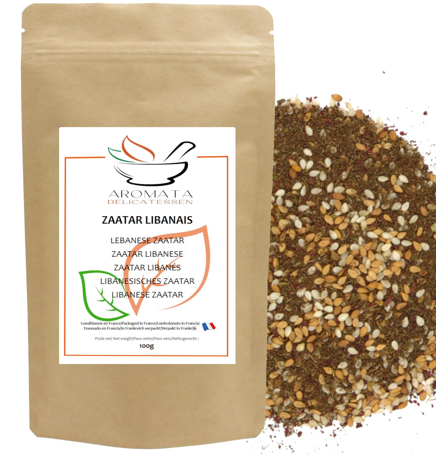 Zaatar Mix, Lebanese cuisine, 100g, resealable kraft paper bag. Ingredients: Sumac, white sesame seeds, golden sesame seeds, thyme, salt (14 ). Made from natural ingredients, without additives or preservatives. Directions for use: Depending on how it's used, cooked or raw, zaatar can be used in all types of dishes, in combination with all types of ingredients. It is not recommended to add salt, as it is already present in the sumac it contains. In the kitchen: Bring Lebanon to your table by preparing authentic recipes! Zaatar adds flavor to many dishes, such as chicken with zaatar and preserved lemons, and can be sprinkled on meatballs or vegetables. In summer, Za'atar adds freshness to your salads, pizzas, bruschetta, and marinades, but we also love to enjoy it simply mixed with olive oil and spread on bread before baking. The most commonly used Lebanese spices in Lebanese, Iranian, Turkish, and Greek cuisines are "Lebanese thyme" (or za'atar), coriander, nigella seeds, and sumac, with coriander being the quintessential Lebanese spice. Add za'atar to hummus, shish taouk, fattoush salad, baba ghanoush, falafel, and more. Our Za'atar is packaged in France. AROMATA carefully selects its spices to bring you exceptional quality. The opaque, food-grade bag, which can be hermetically sealed with a zip closure, protects your spices from moisture. INGREDIENTS Sumac, white sesame seeds, golden sesame seeds, thyme, salt (14 ) INSTRUCTIONS FOR USE Store in its original packaging. Reseal the bag tightly after use. See moreAROMATA - Zaatar Za'atar - Cuisine libanaise - 100 naturel - 100gr - Mélange d'épices ZaatarDESCRIPTION DU PRODUIT DESCRIPTION DU PRODUIT Mélange Zaatar, cuisine libanaise, 100g, sachet kraft refermable. Composition : Sumac, graines de sésame blanc, graines de sésame doré, thym, sel (14 ). Fabriqué à partir d'ingrédients naturels, sans additifs ni conservateurs. Conseils d'utilisation : Selon son utilisation, cuit ou cru, le zaatar peut être utilisé dans tous les types de plats, en association avec tous les types de plats. Il est déconseillé d'y ajouter du sel, déjà présent dans le sumac qu'il contient. En cuisine : invitez le Liban à table en préparant des recettes authentiques ! Le Zaatar parfume de nombreux plats, comme le poulet au Zaatar et aux citrons confits, et peut être saupoudré sur des boulettes de viande ou des légumes. En été, le Zaatar apporte de la fraîcheur à vos salades, pizzas, bruschettas et marinades, mais nous aimons aussi le consommer simplement mélangé à de l'huile d'olive et tartiné sur du pain avant cuisson. Les épices libanaises les plus couramment utilisées dans les cuisines libanaise, iranienne, turque et grecque sont le « thym libanais » (ou zaatar), la coriandre, la nigelle et le sumac, la coriandre étant l'épice libanaise par excellence. Ajoutez le zaatar au houmous, au chich taouk, à la salade fattouche, au caviar d'aubergine, aux falafels, etc. Notre Zaatar est conditionné en France. AROMATA sélectionne soigneusement ses épices pour vous apporter une qualité exceptionnelle. Le sachet opaque alimentaire, qui peut être fermé hermétiquement par un zip, protège vos épices de l'humidité. INGRÉDIENTS Sumac, graines de sésame blanc, graines de sésame doré, thym, sel (14 ) MODE D'EMPLOI A conserver dans son emballage d'origine. Bien refermer le sachet après utilisation. Voir plus